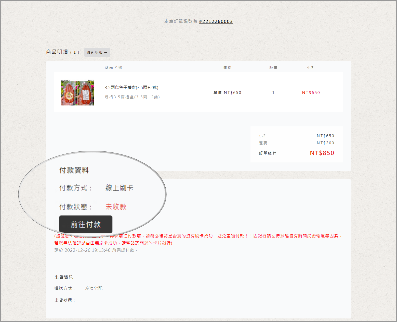 如果消費者已完成訂單,但尚未完成付款時,將會在『訂單完成』及『訂單查詢』頁面中,出現「前往付款」的按鈕提示。