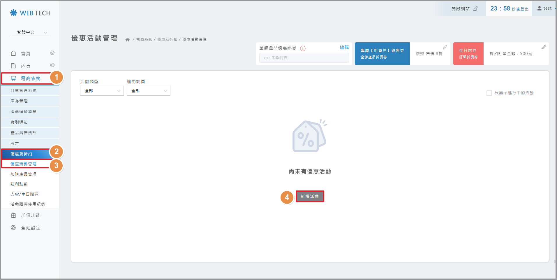 STEP 1:進入米洛後台網站,點選「電商系統」>「優惠及折扣」>「優惠活動管理」>「新增活動」
