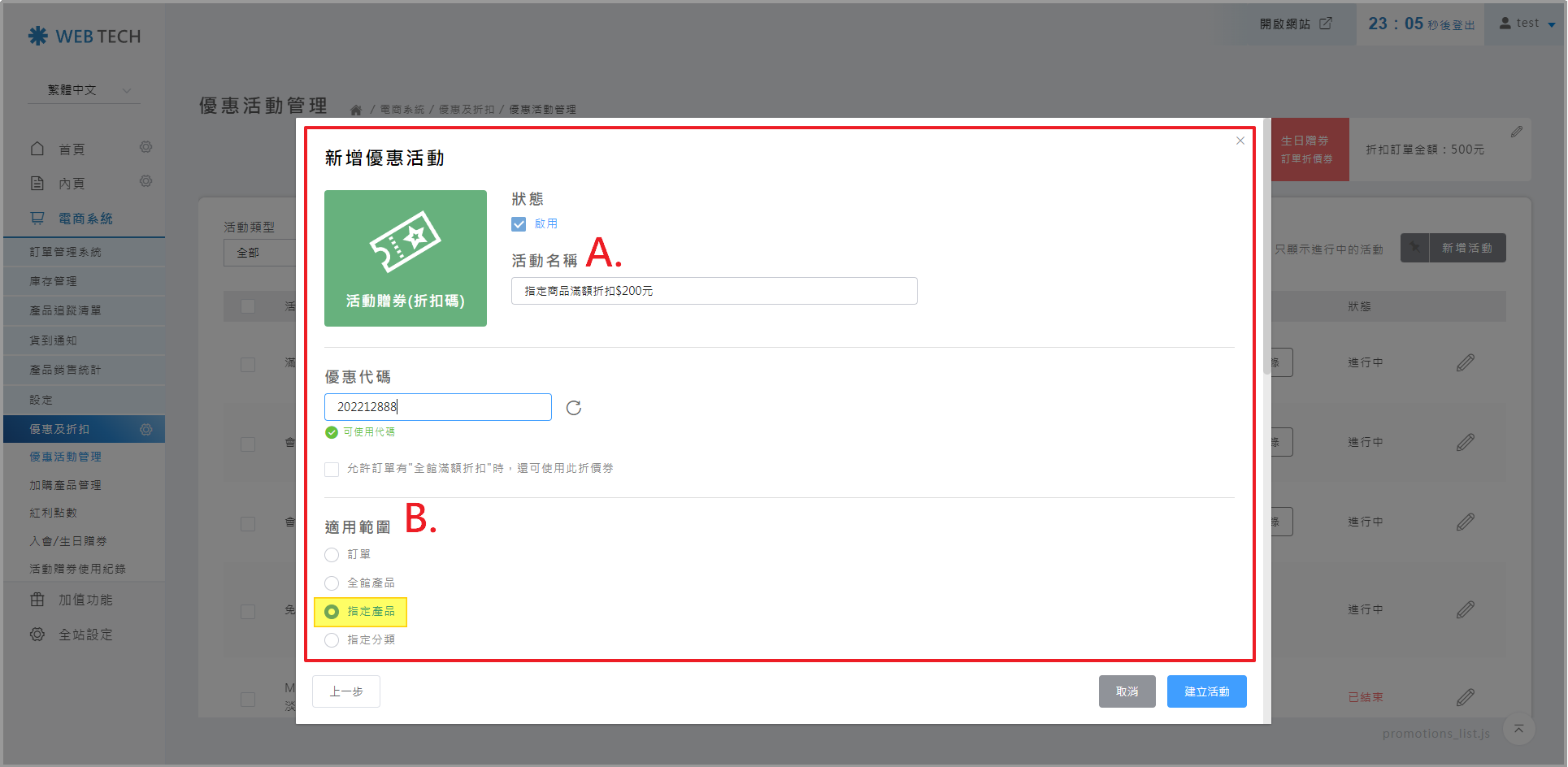 STEP 2:首先編輯 A.「活動名稱」,並且選擇此優惠活動的 B.「適用範圍」。