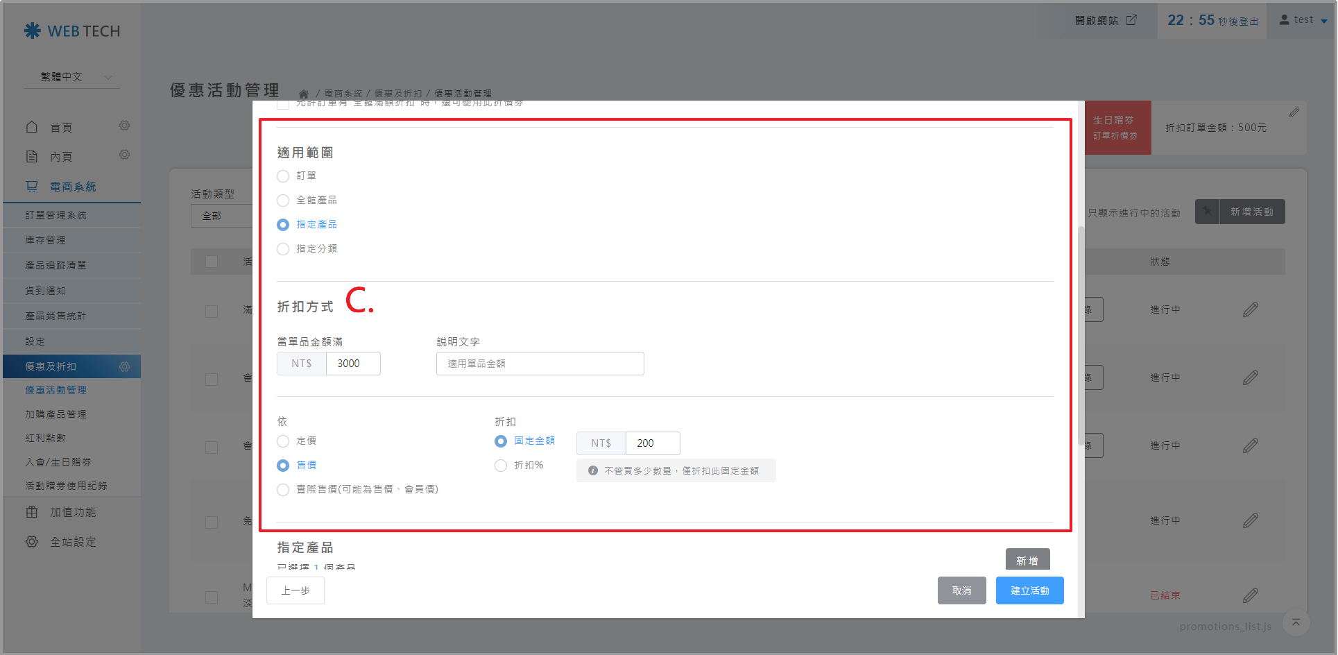 ※ 注意:優惠活動可針對「指定商品」、「指定分類」進行滿額折扣的優惠。