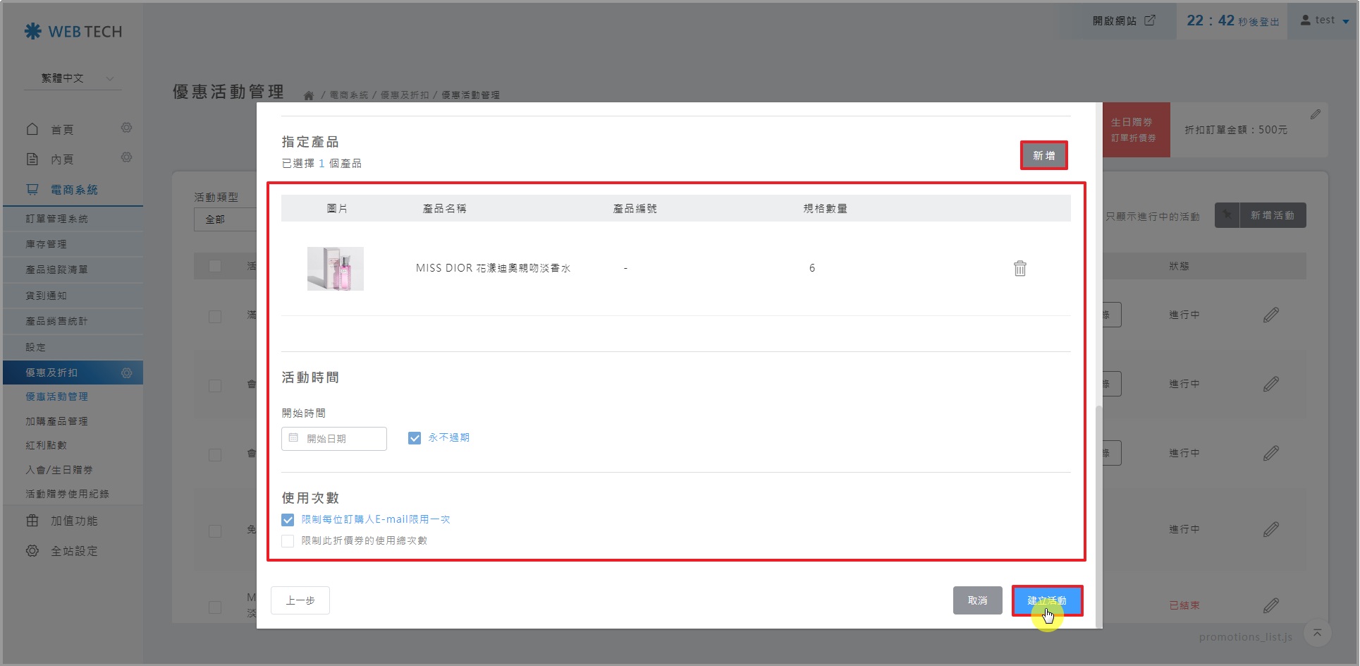 STEP 4:如果是「指定產品」才享優惠,須先於此步驟「新增」,並選擇「適用活動的產品」及相關內容,最後點選「建立活動」