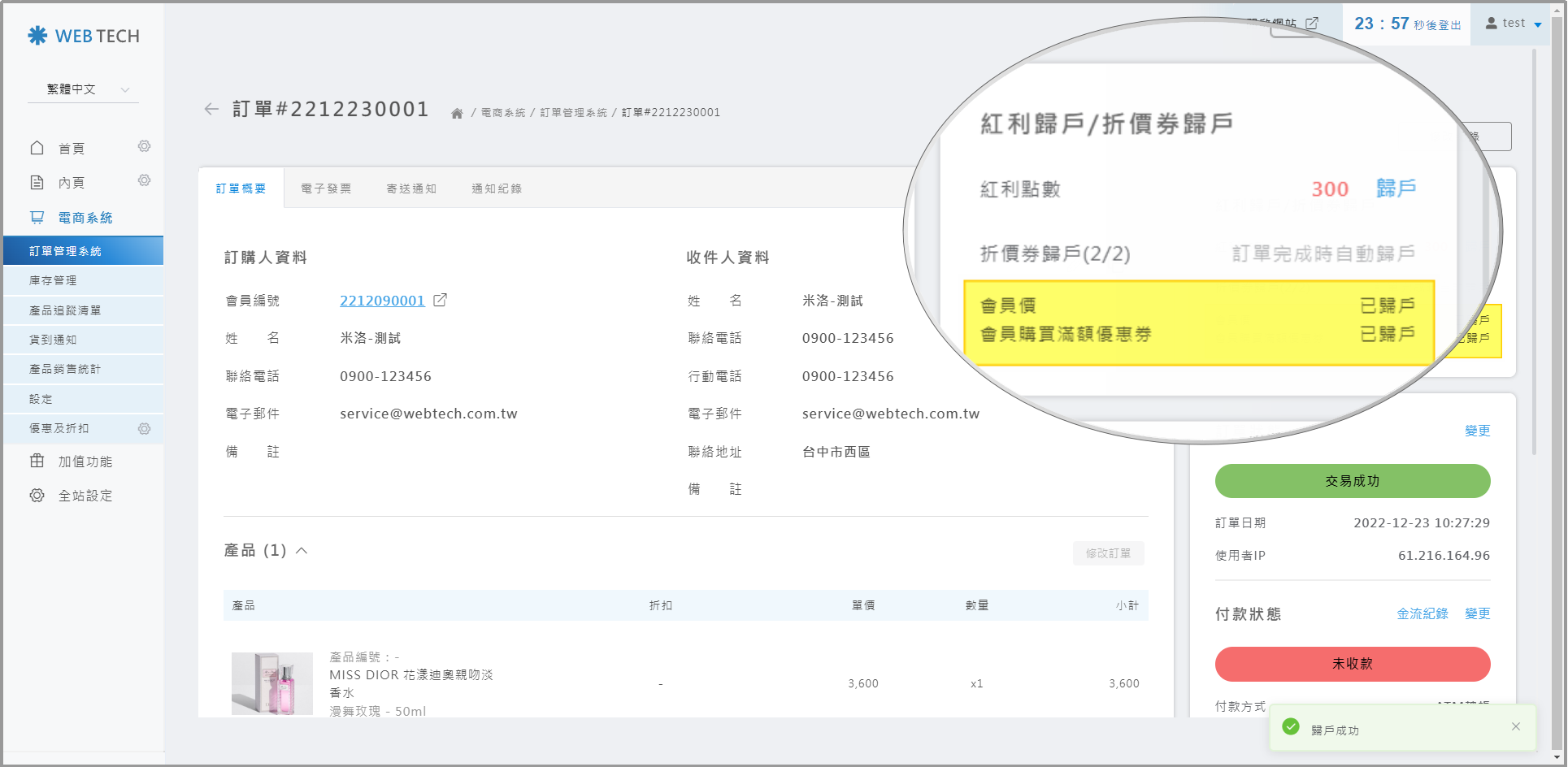 於後台「訂單管理系統」中,當訂單之「訂單狀態」為「交易成功」後,將可看到如下方<附圖>的畫面,出現「已歸戶」的提示於「折價券歸戶」中