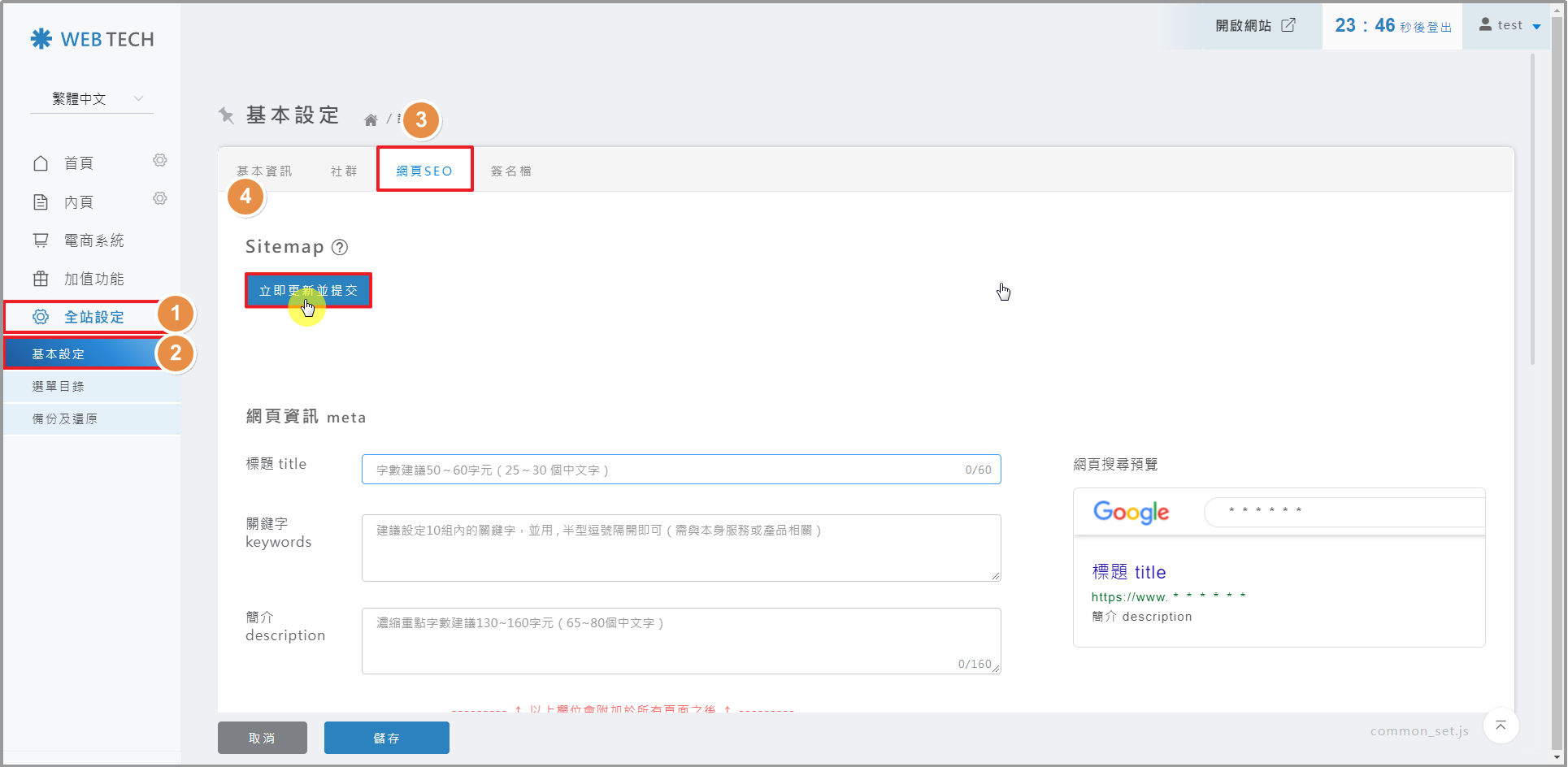 STEP 1:進入米洛後台,點選「全站設定」>「基本設定」>「網頁SEO」>點選「立即更新並提交」