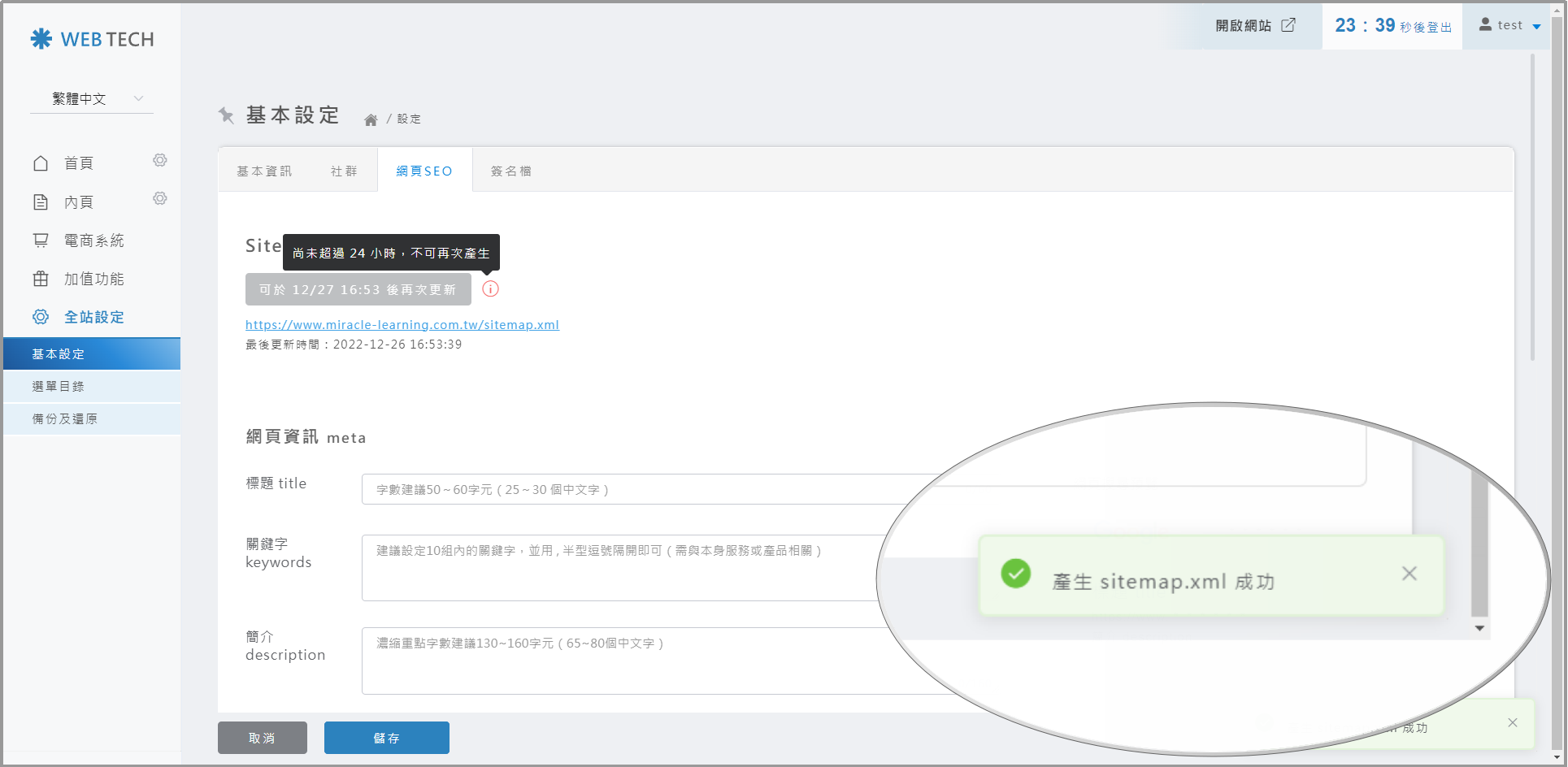 ※ 注意:24小時內即可產生一次,建議於網站新增內容後點擊。