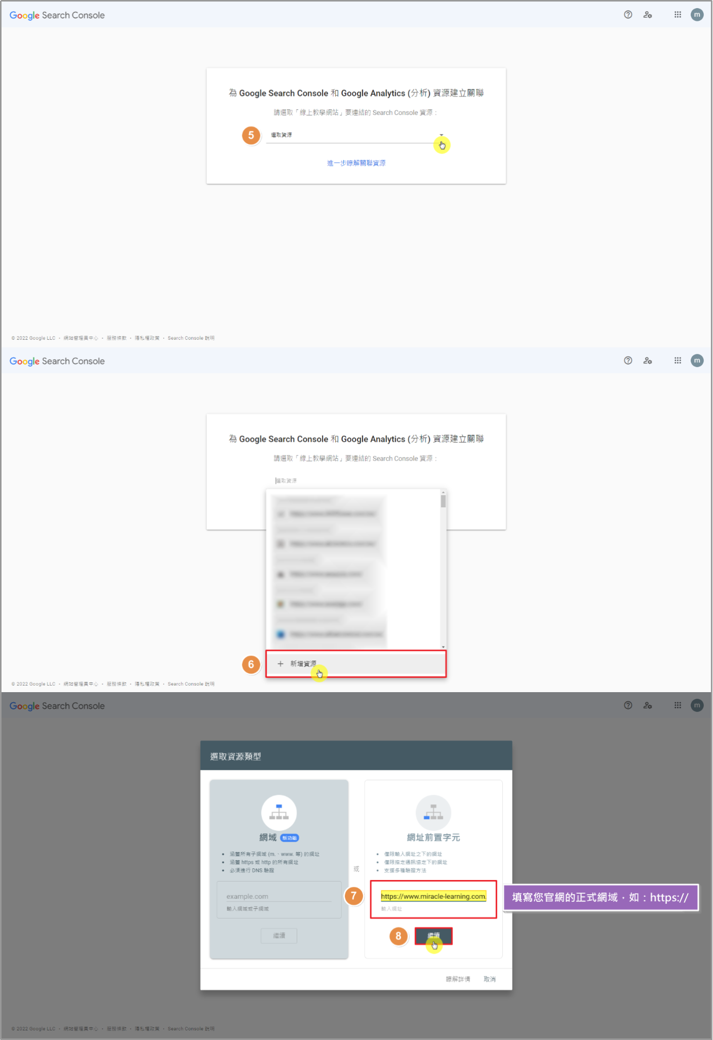 STEP 4:繼續選擇「選取資源」的下拉選單>「新增資源」>在「網址前置字元」中填入您的官網正式網域>完成後點擊「繼續」