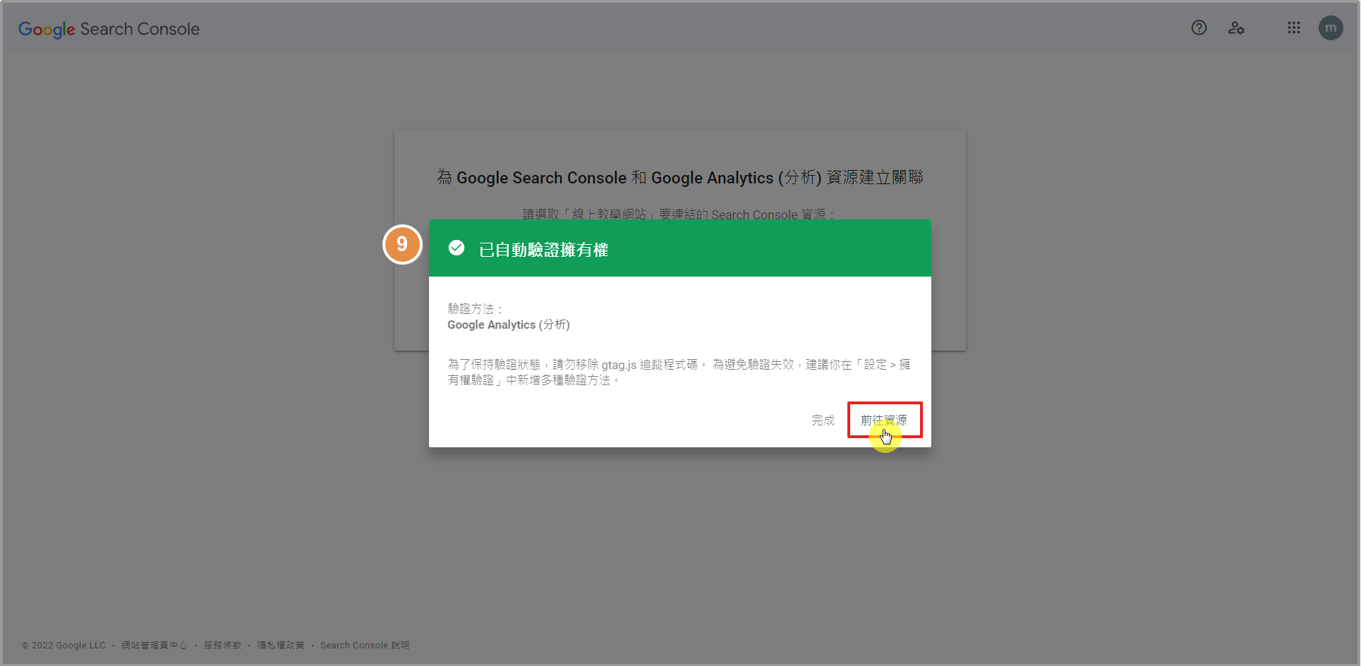 STEP 5:出現『已自動驗證擁有權』的提示後,選擇「前往資源」