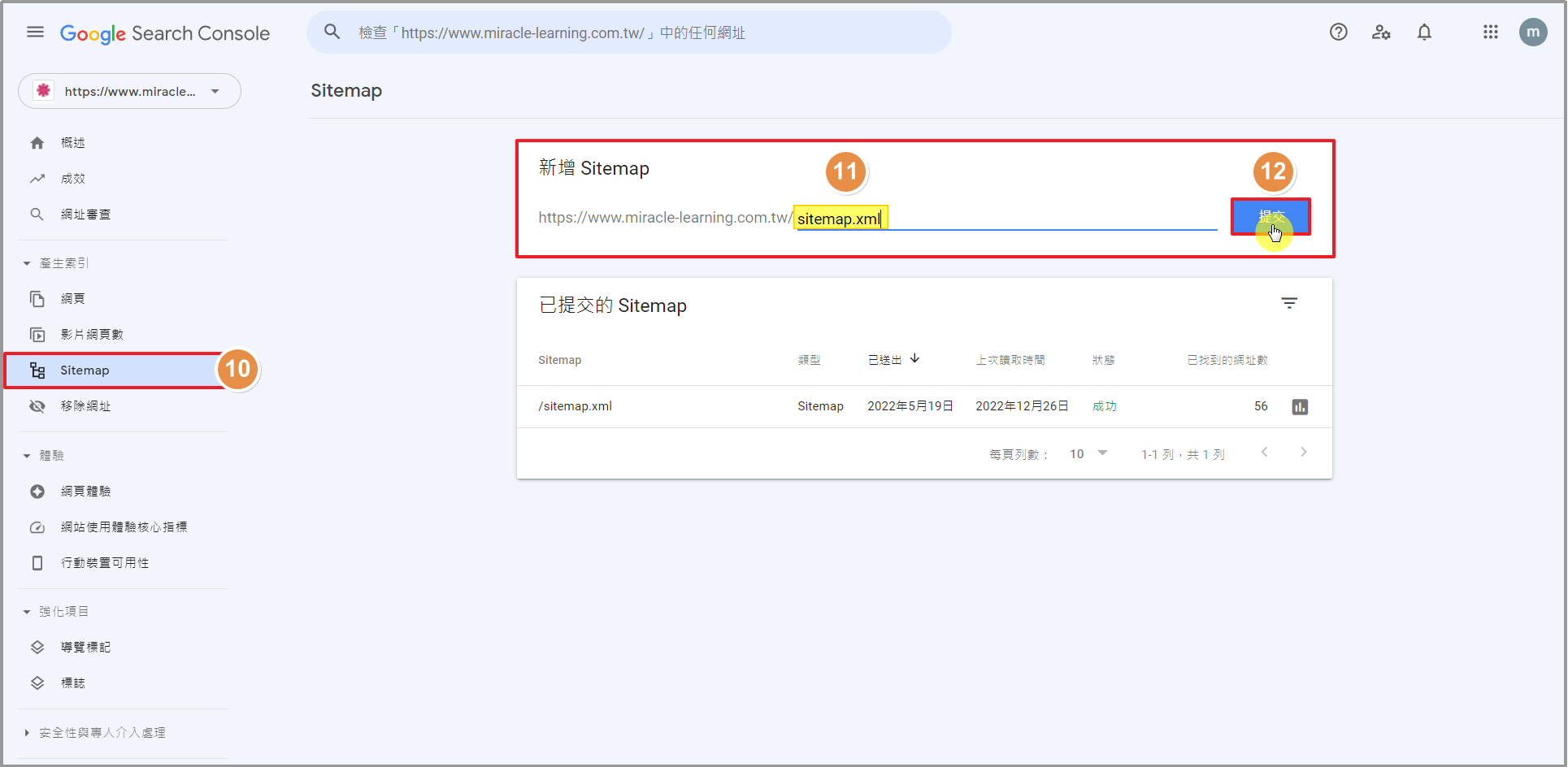 STEP 6:點擊左側選單「Sitemap」>於「新增 Sitemap」中輸入:「sitemap.xml」>完成後點擊「提交」