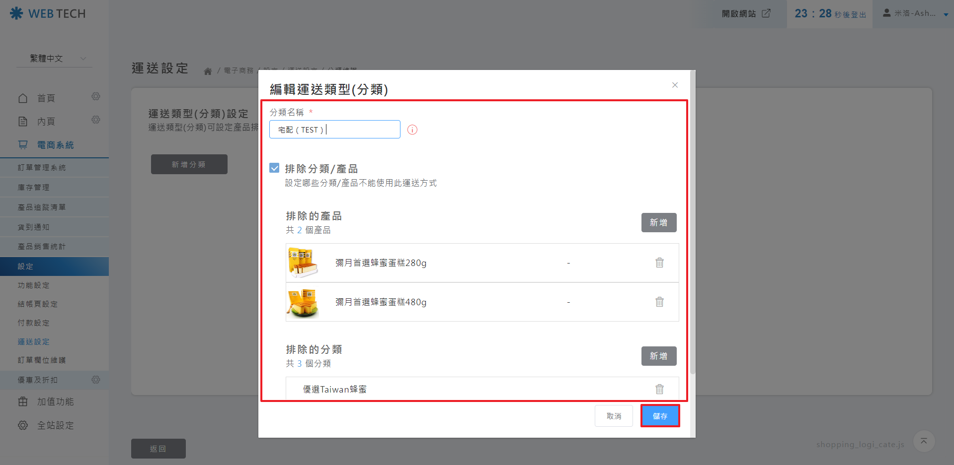 STEP 3:編輯輸入「分類名稱」(如:宅配(TEST)),並勾選「排除分類/產品」,並於「排除的產品」或「排除的分類」中點選「新增」,選擇要排除的產品或分類,如下方附圖,完成後點選 >「儲存」即可完成設置