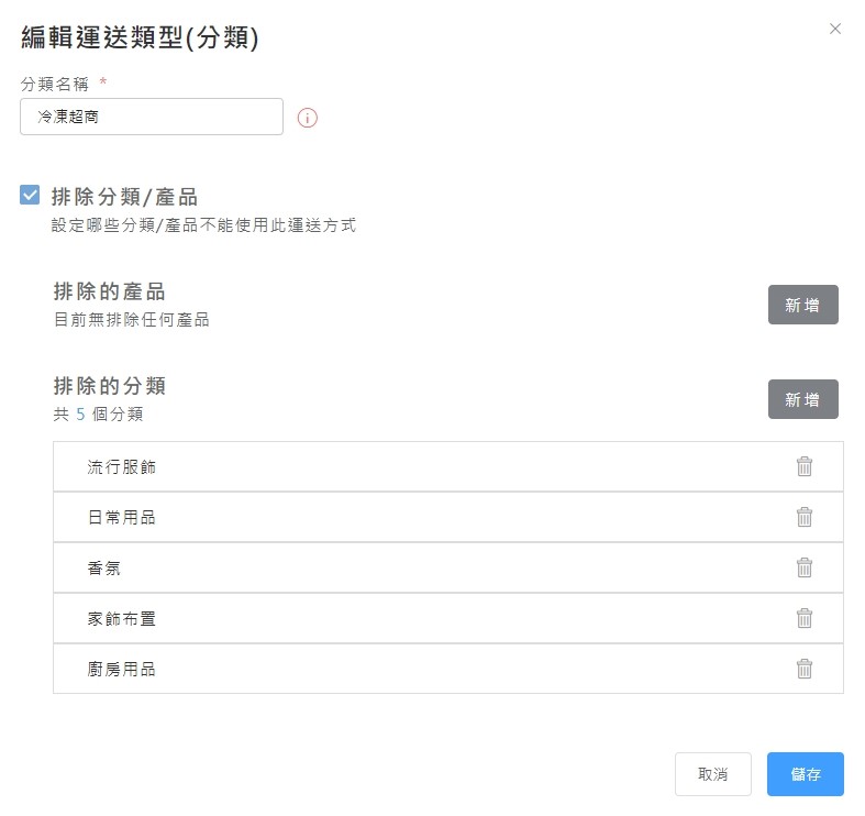 2、在【運送類型(分類)】新增運送類型,「可以排除不適用的產品/分類」的功能。
