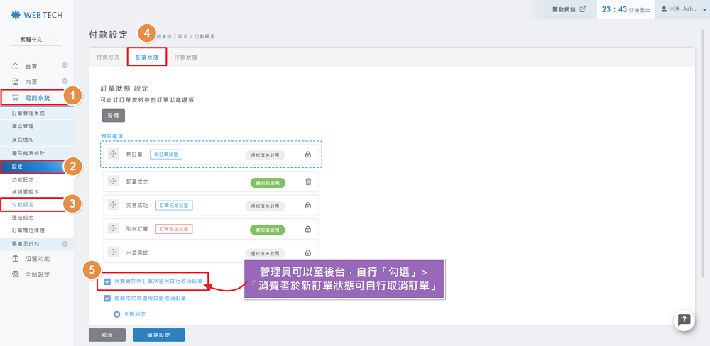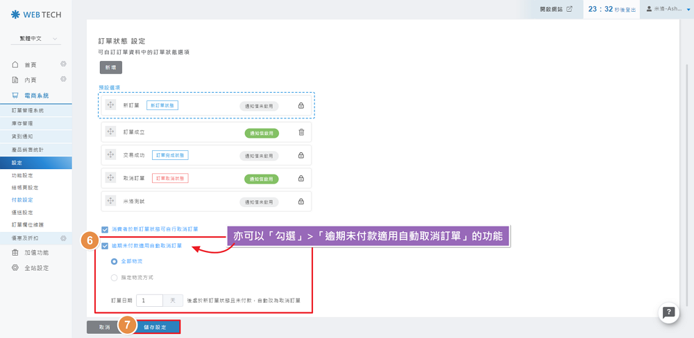 現在推出的自動化「取消訂單」功能,讓消費者在下單後,如果想要取消訂單,只需要簡單點選按鈕,就可以完成動作,無需聯繫網站客服或等待人工處理。不僅如此,這次還同步增加「逾期未付款」將自動取消訂單的項目,而且在訂單被取消後,系統就會直接把該筆訂單標記為「訂單取消」的狀態,讓管理員工作更有效率。 |
