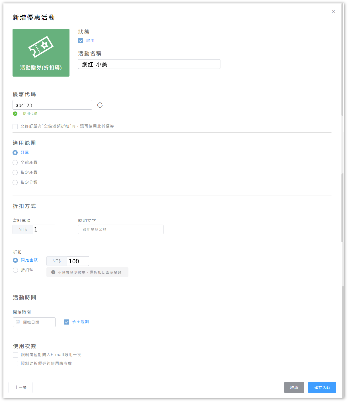 ●「商品折價券」:可以針對全館/指定產品進行打折或折抵金額(經常用來促銷某一項產品使用)
