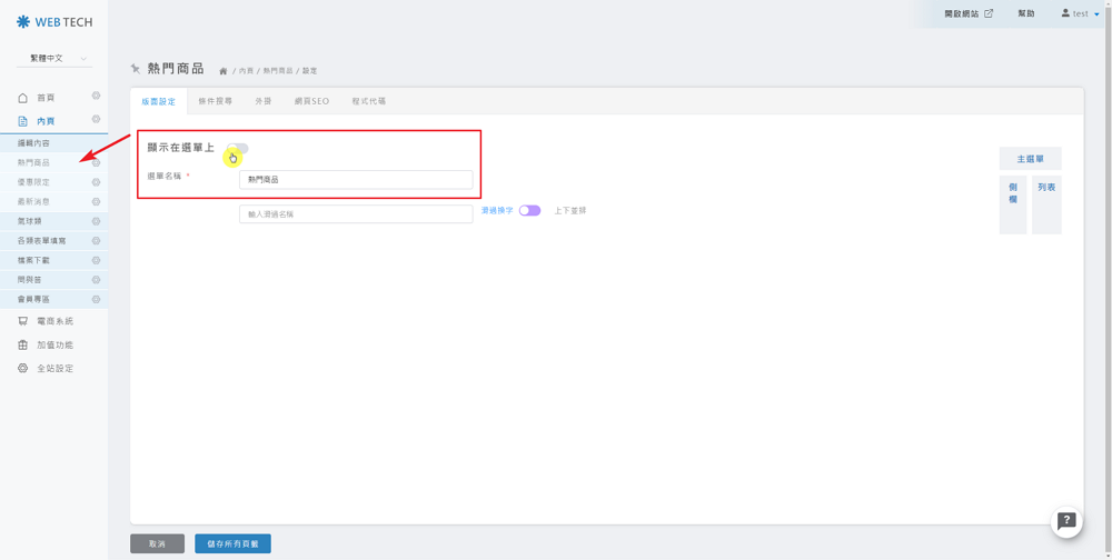 在經過優化之後,現在管理員只要將該選單的「顯示在選單上」功能調整為關閉後,在後台選單列中,該選單就會呈現為「淺色的效果」(如下方《附圖》箭頭指示處),讓管理者可以輕鬆且更清晰的區分出各個選單的狀態。 |