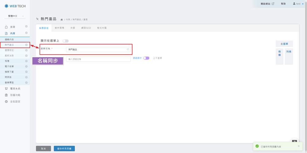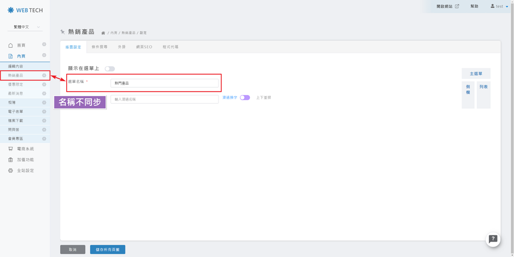 過去,當管理員在編輯更改「選單名稱」欄位的內容並儲存後,(如下方《附圖1》),前台的選單會隨之變更為新名稱,但是位於後台的選單列,卻仍然顯示原來系統設定的「選單名稱」,造成管理員不易辨識及管理上的不便。 |
