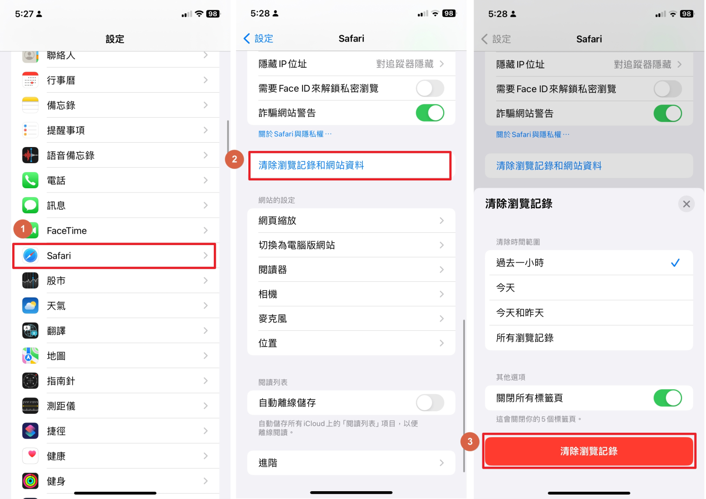 隱私權安全性>清除瀏覽資料