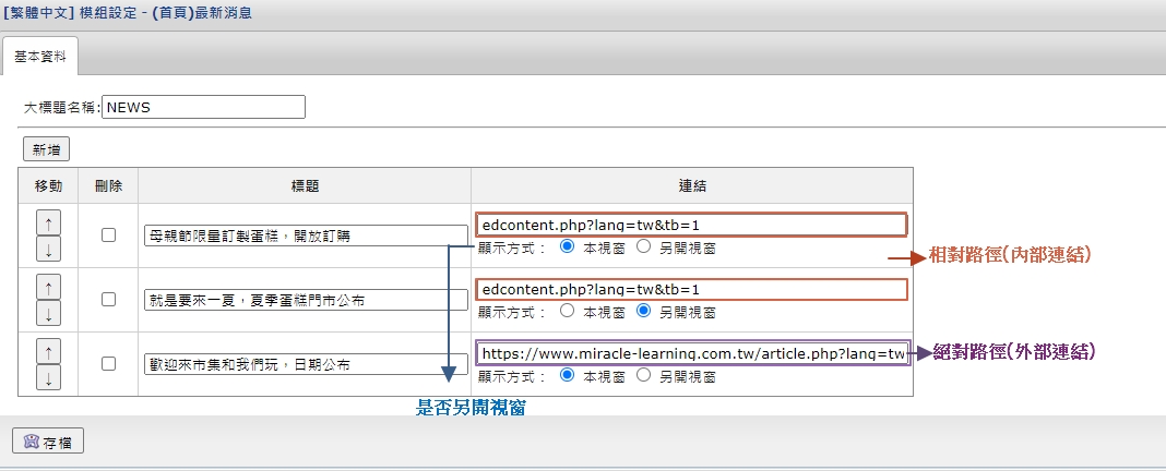 • 例子:我要設定導向連結的站內網頁URL為:https://www.rwdwebsite.com/article.php?lang=tw&tb=1