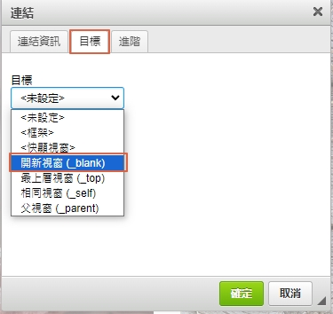 如果有需要另開視窗效果,可切換到「目標」頁籤,並選擇「開新視窗」。