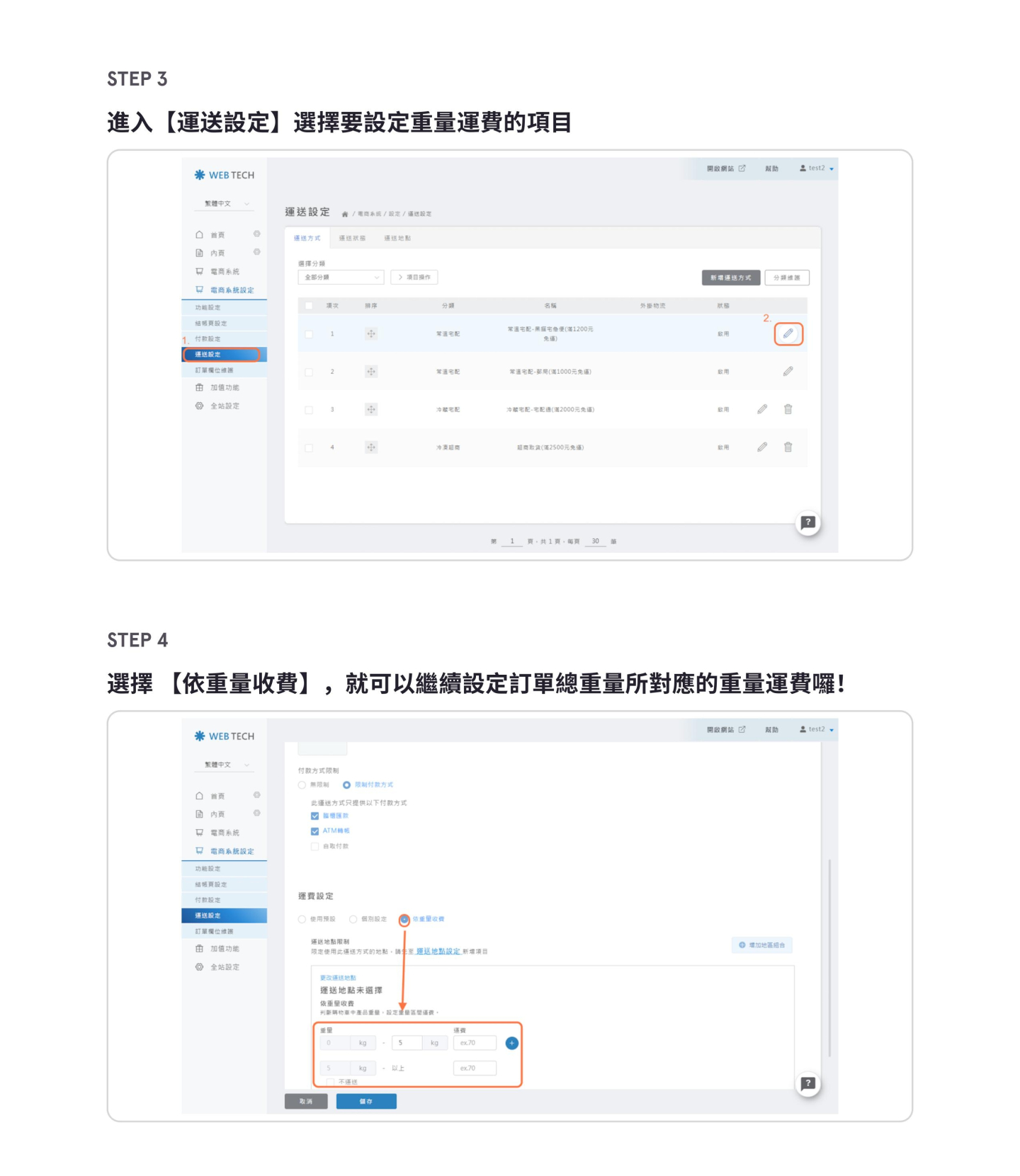 或者需要在總訂單重量超過某個公斤數時加收運費時,我們可以使用重量運費的方式來達成這些需求。