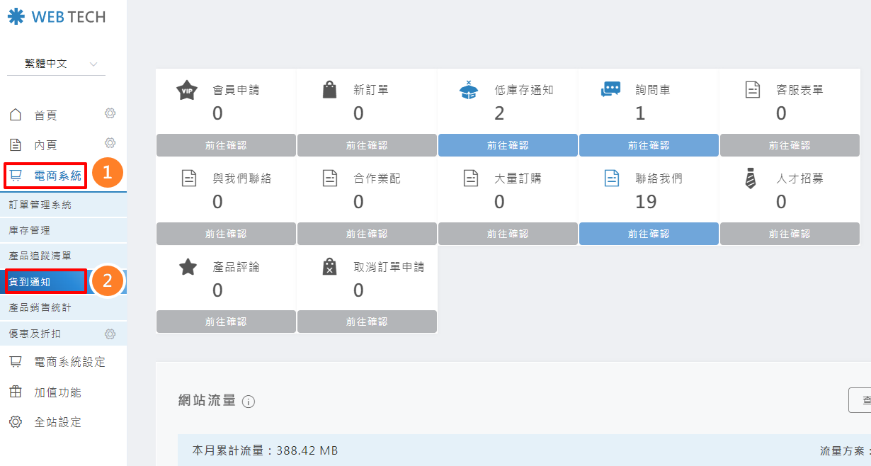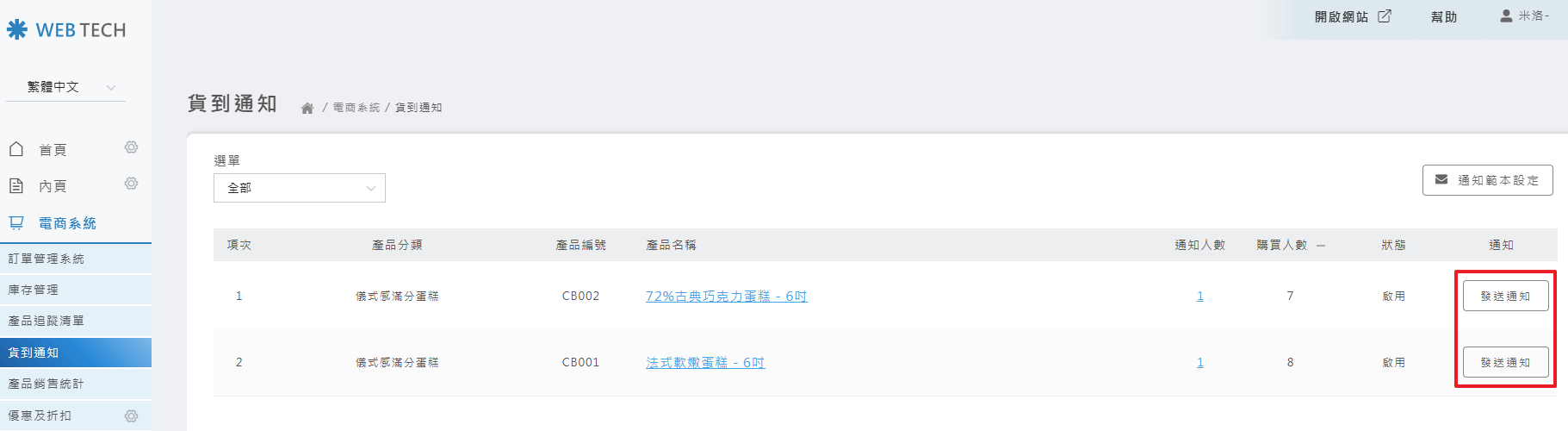 進入米洛後台網站,點選「電商系統」>「貨到通知」
