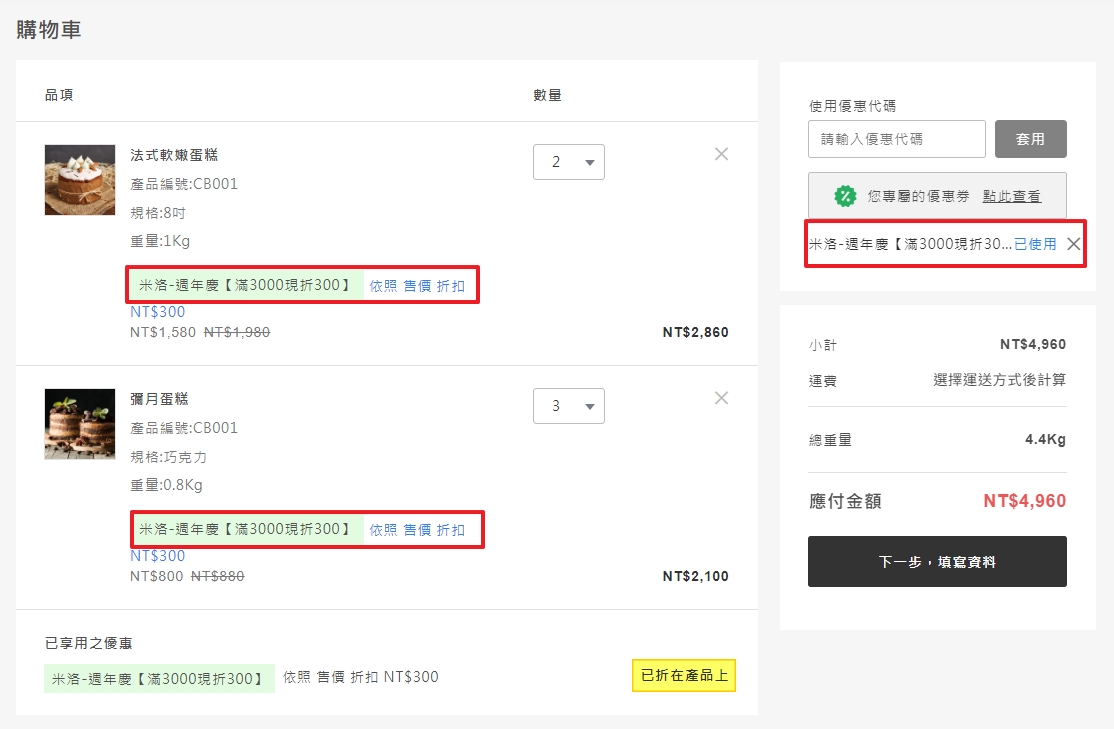 【已開通】一張產品優惠券能套用訂單中所有符合優惠項目的品項。