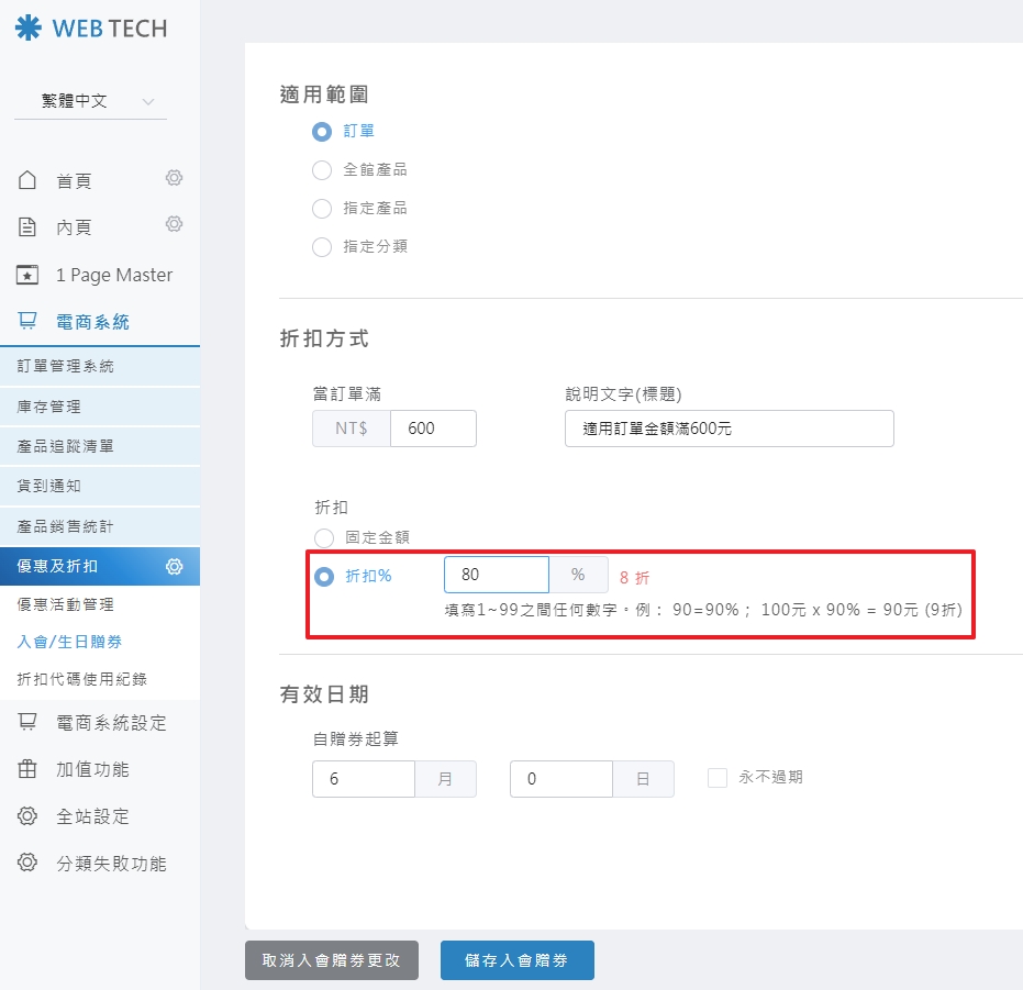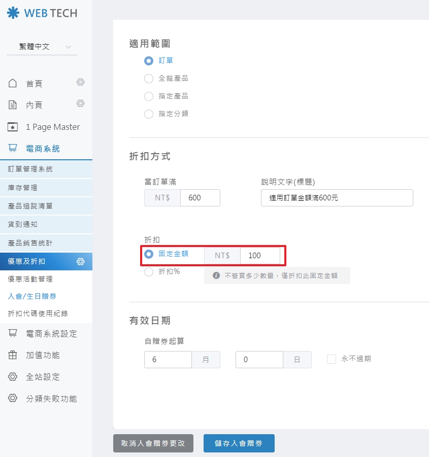 ➤ 折扣方式:設定優惠券折扣「固定金額」或「折扣%數」