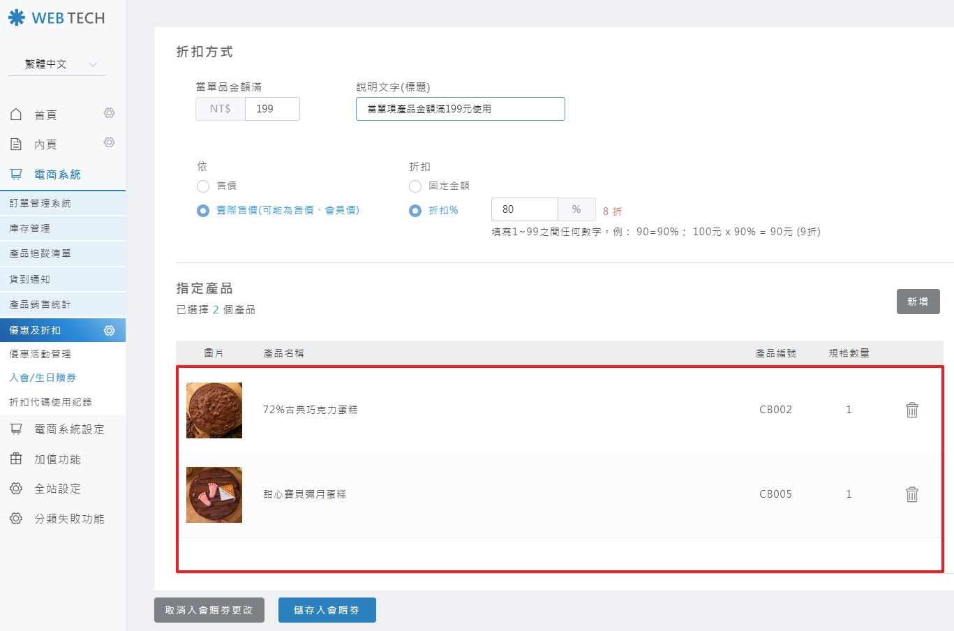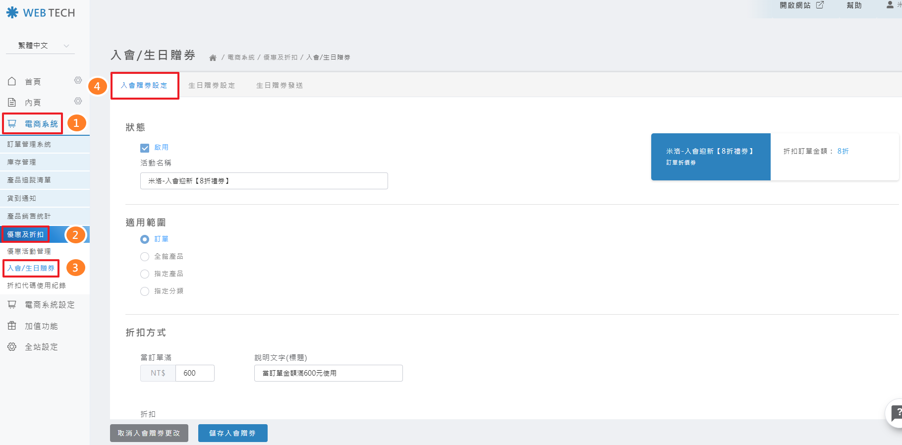點選「電商系統」>「優惠及折扣」>「入會/生日贈券」> 點選「入會贈券設定」頁籤