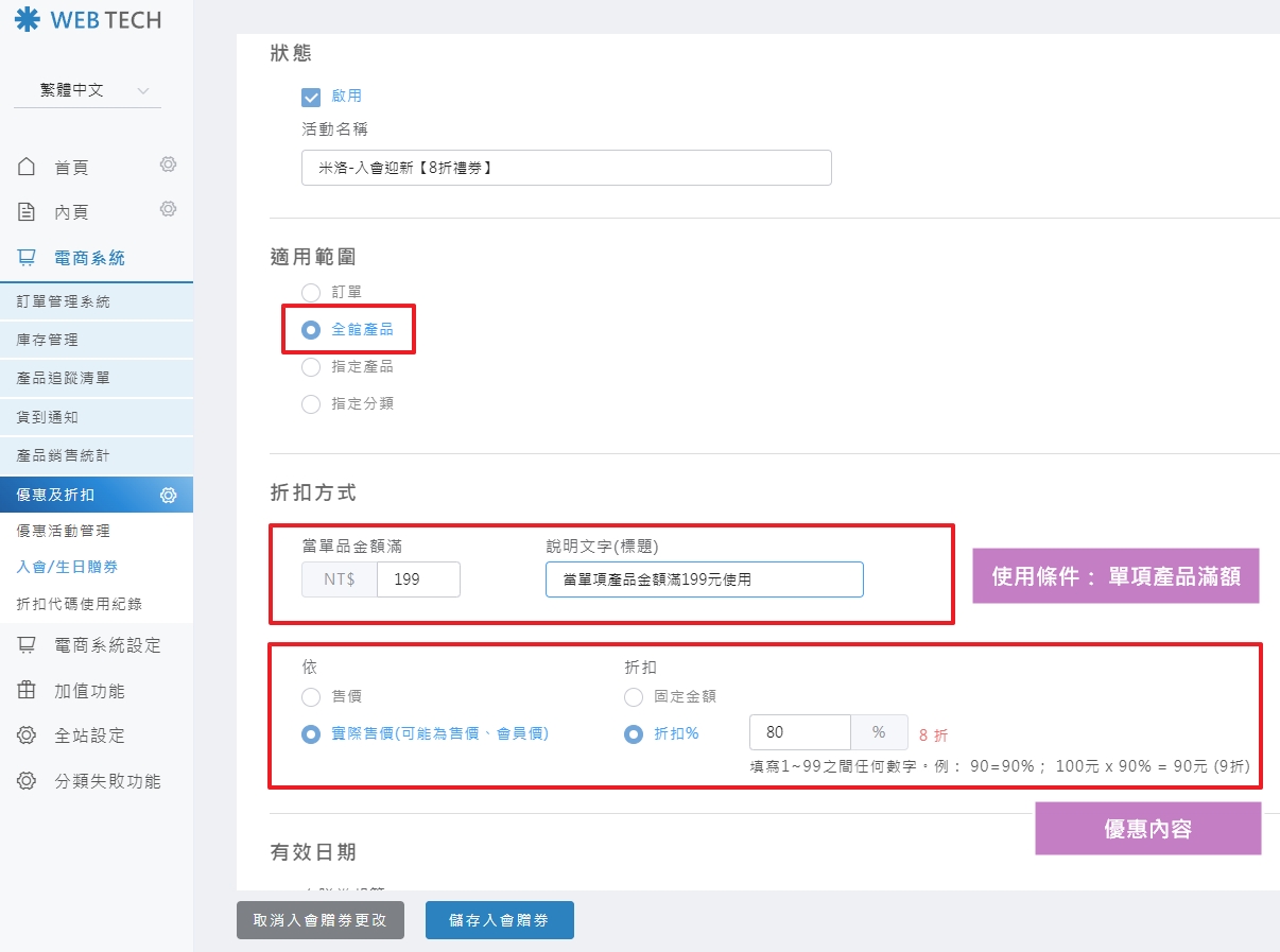 ➤ 優惠券啟用金額:設定「單項產品」滿額的最低金額,並輸入說明文字 (例如:當單項產品金額滿199元使用)。