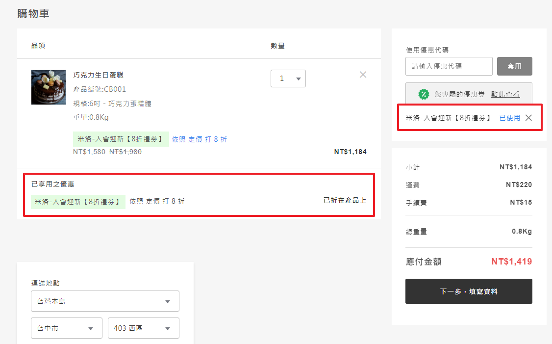 套用「入會優惠券」後,在結帳畫面會顯示「已享用之優惠」明細,產品價格已更新為折扣後的金額。