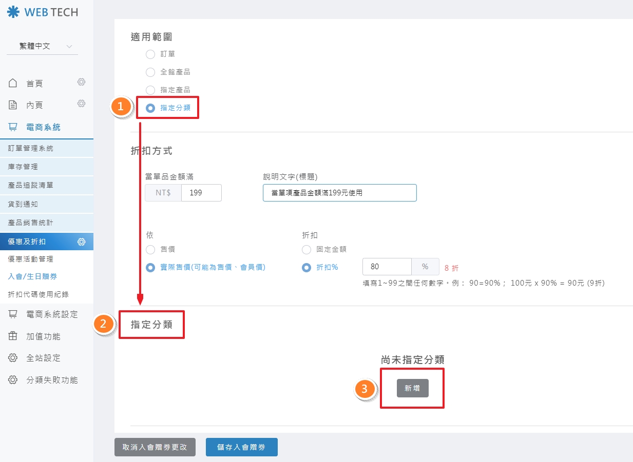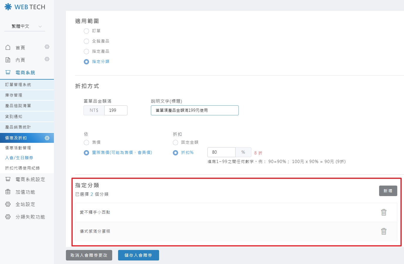 ❖ 指定分類:針對「特定分類內的產品」做折扣 (系統預設不限制購買數量)。