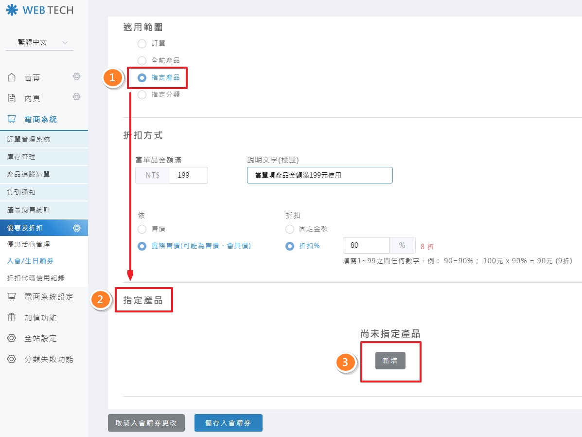 ❖ 指定產品:針對「特定產品」做折扣 (系統預設不限制購買數量)。
