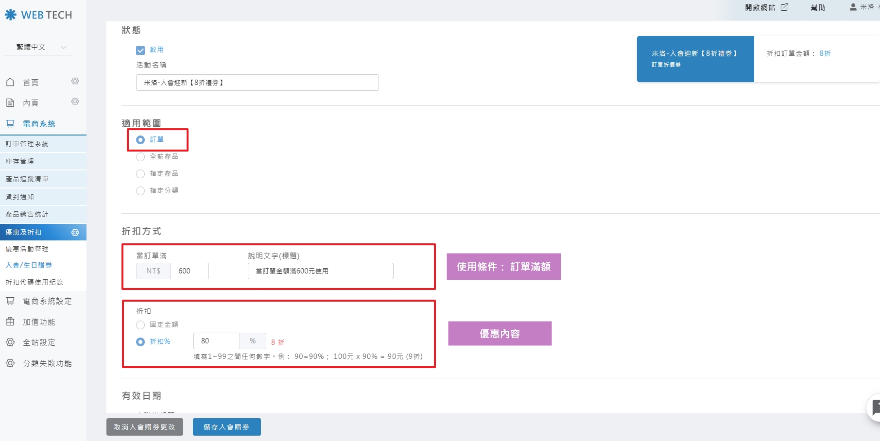 ➤ 優惠券啟用金額:設定訂單啟用優惠券的最低金額,並輸入說明文字 (例如:當訂單金額滿600元使用)。