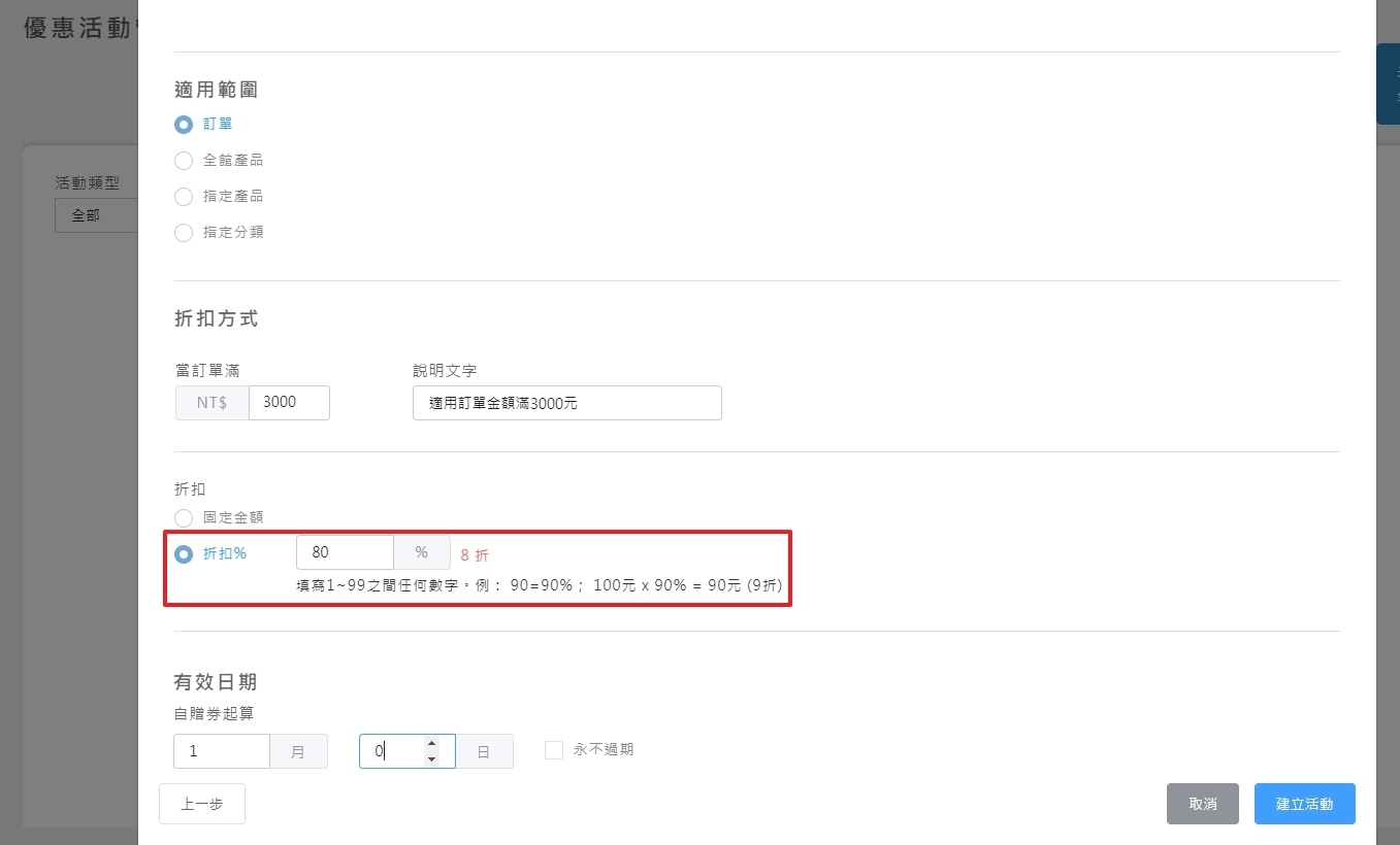 選擇「訂單」後,在下方折扣方式的欄位設定「訂單滿額條件」、「優惠內容」
