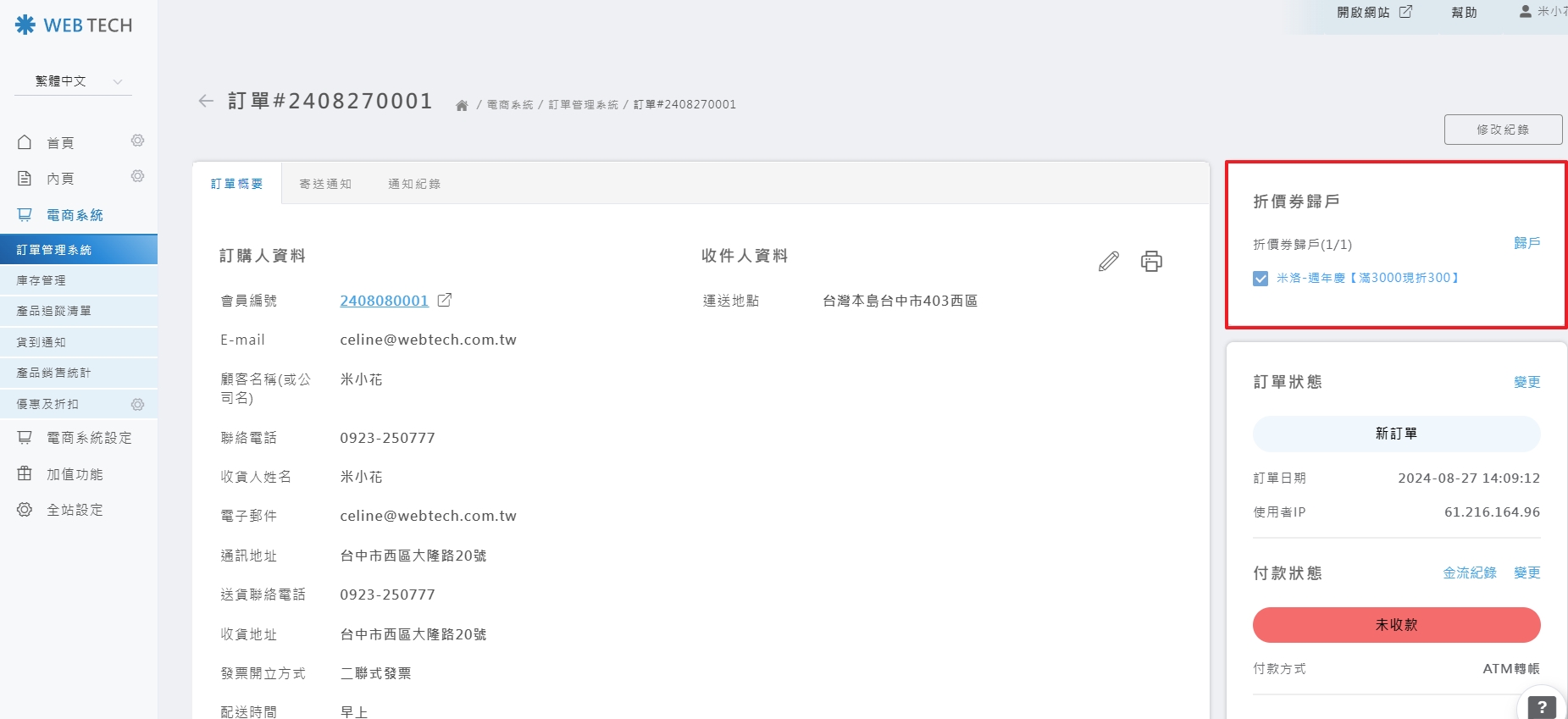 點選「電商系統」>「訂單管理系統」> 點選「欲發送優惠券的訂單」