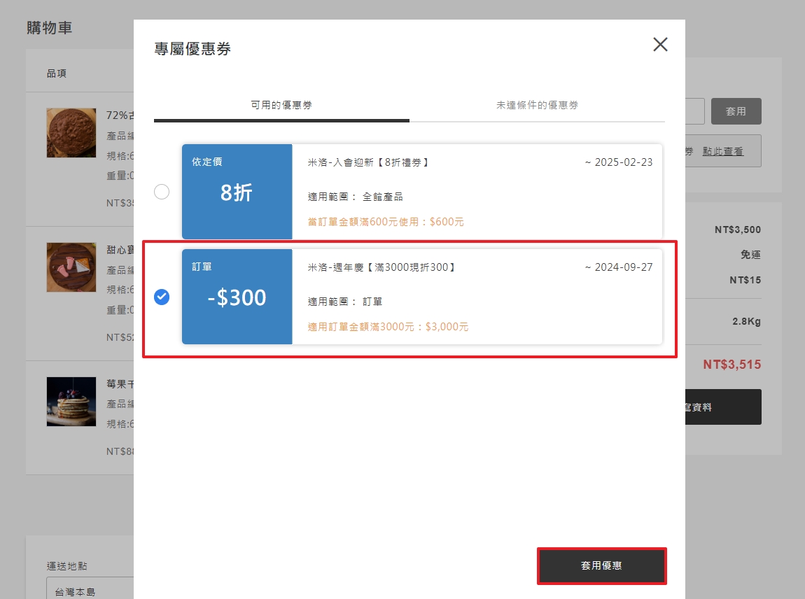 優惠券使用視窗 > 點選「滿額優惠券」> 點擊「套用優惠」即完成。