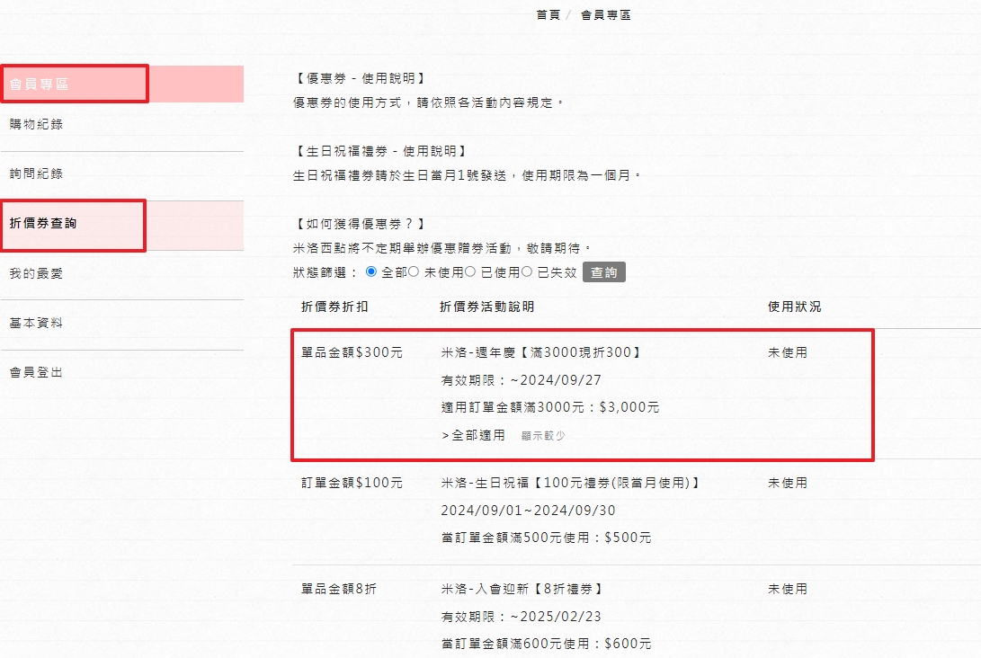 消費者可從「會員專區」>「折價券查詢」中看到所獲得的優惠券。