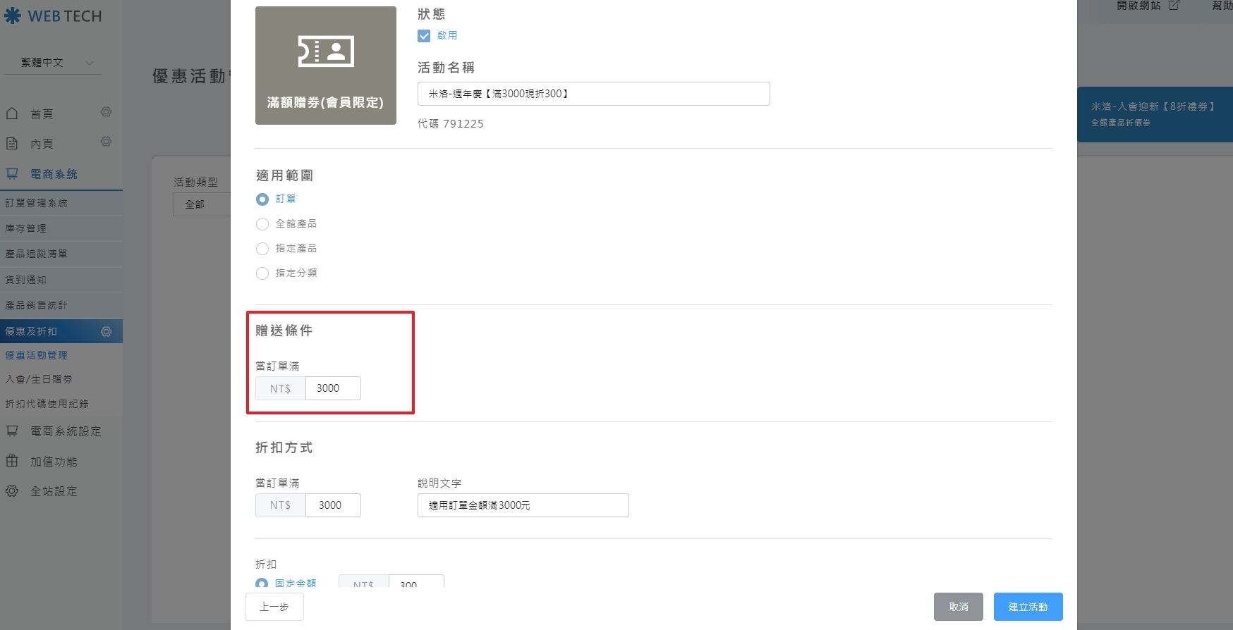 設定「贈送條件」:符合滿額贈券的訂單金額。