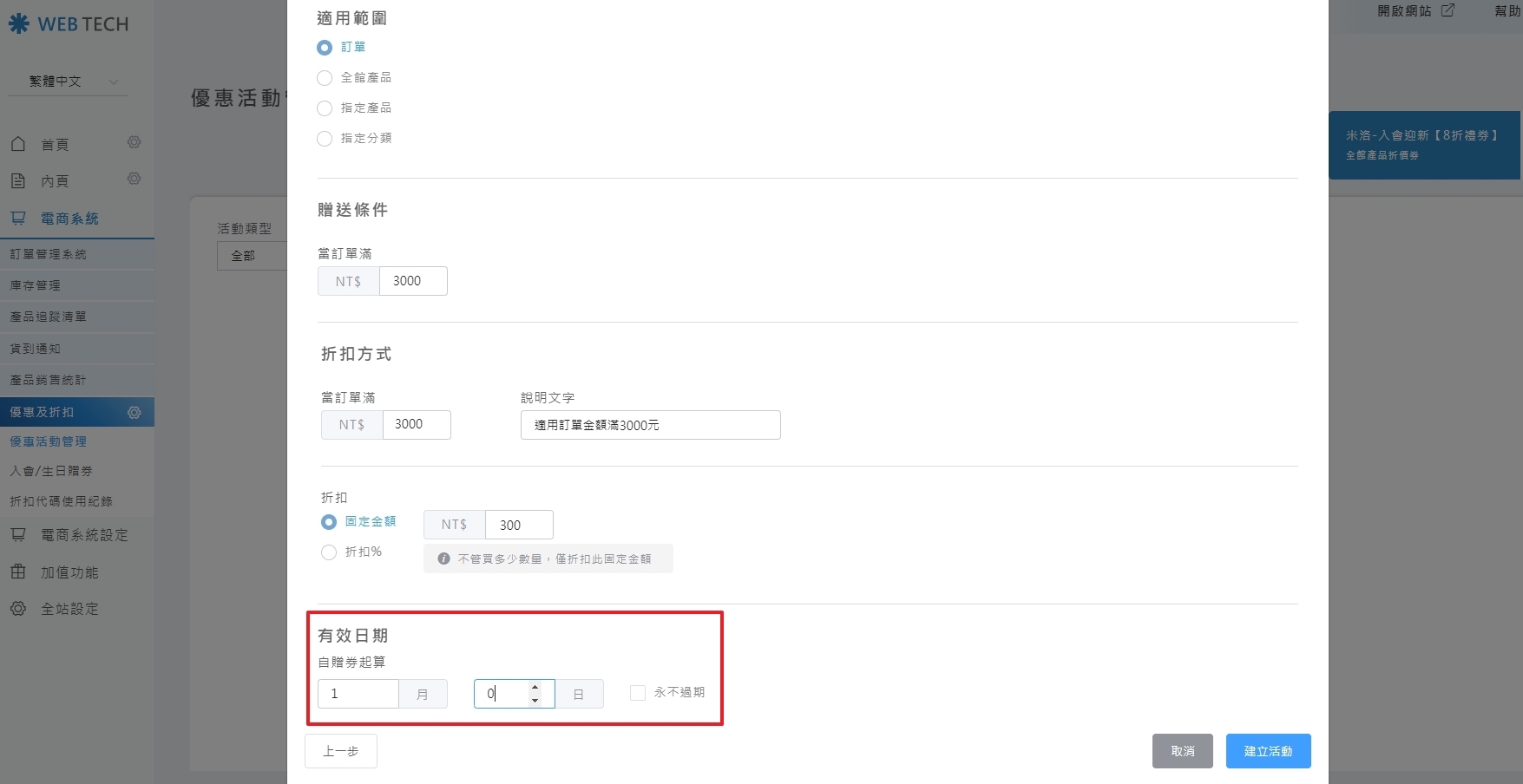 點選「電商系統」>「優惠及折扣」>「優惠活動管理」> 點選「新增活動」