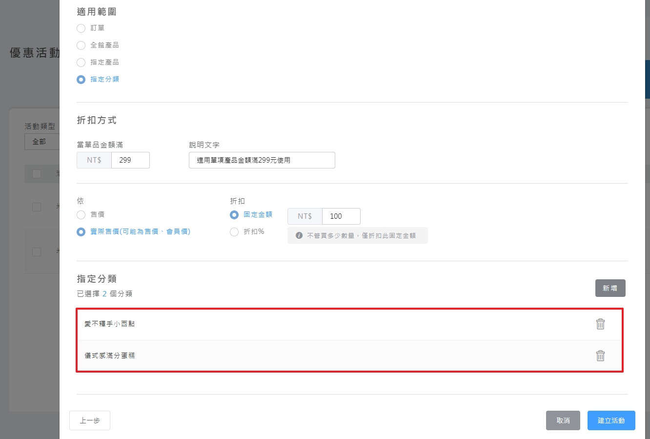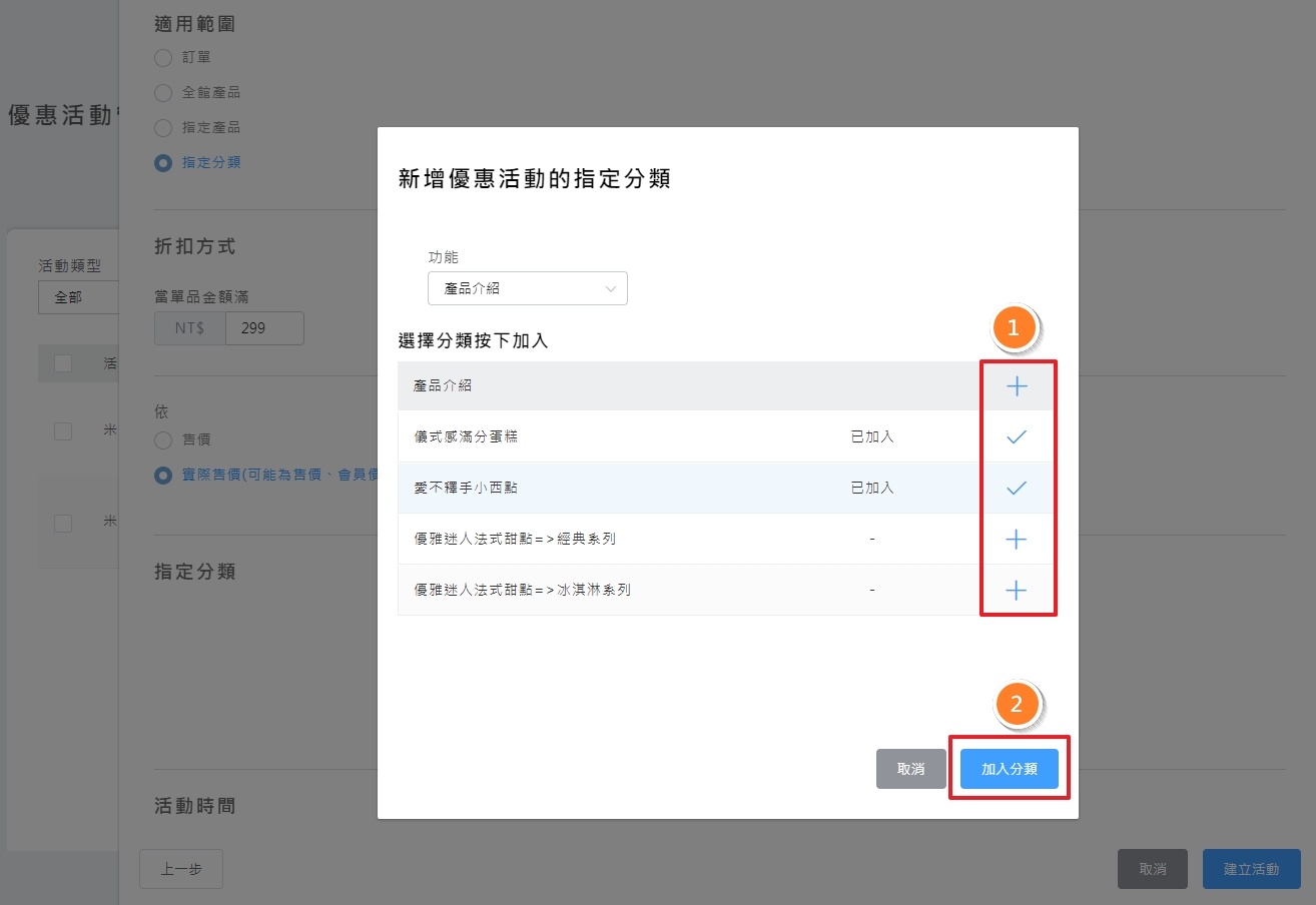 ② 在新增優惠活動的指定分類視窗中,選擇「指定分類」按下加入「┼」,並點擊「加入分類」。