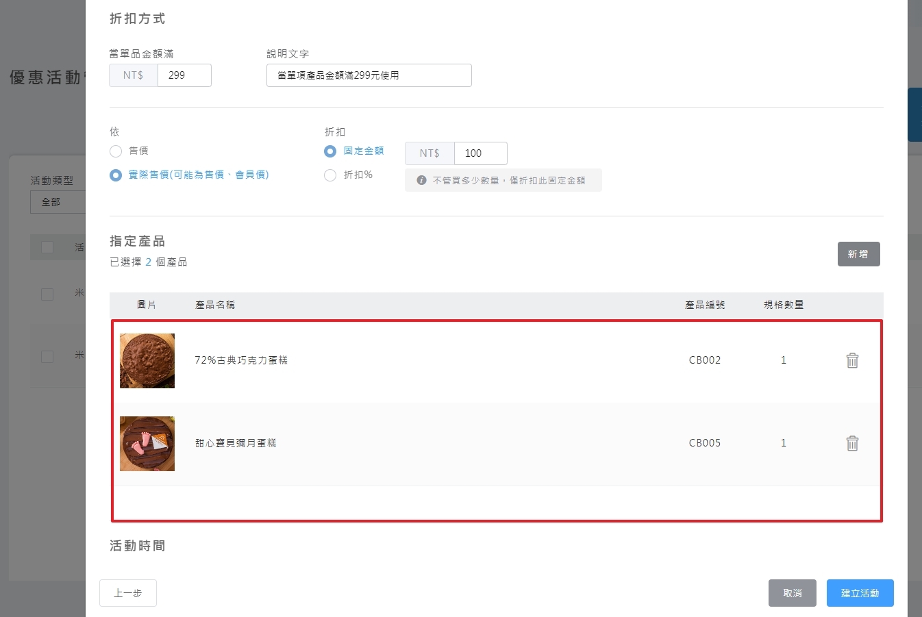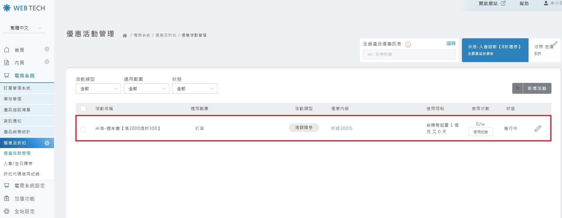 在「優惠活動管理」列表中,會出現設定好的優惠活動喔!