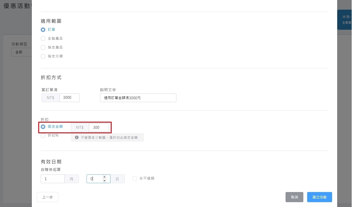 ➤ 折扣方式:設定優惠券折扣「固定金額」或「折扣%數」
