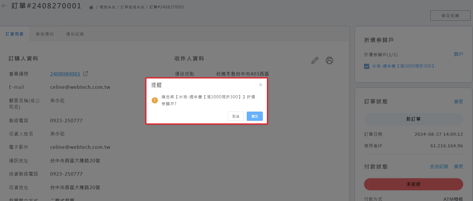 當系統判斷訂單狀態為訂單完成時,在該筆訂單明細裡,右上方「折價券歸戶」欄位中,可看到折價券已自動歸戶。