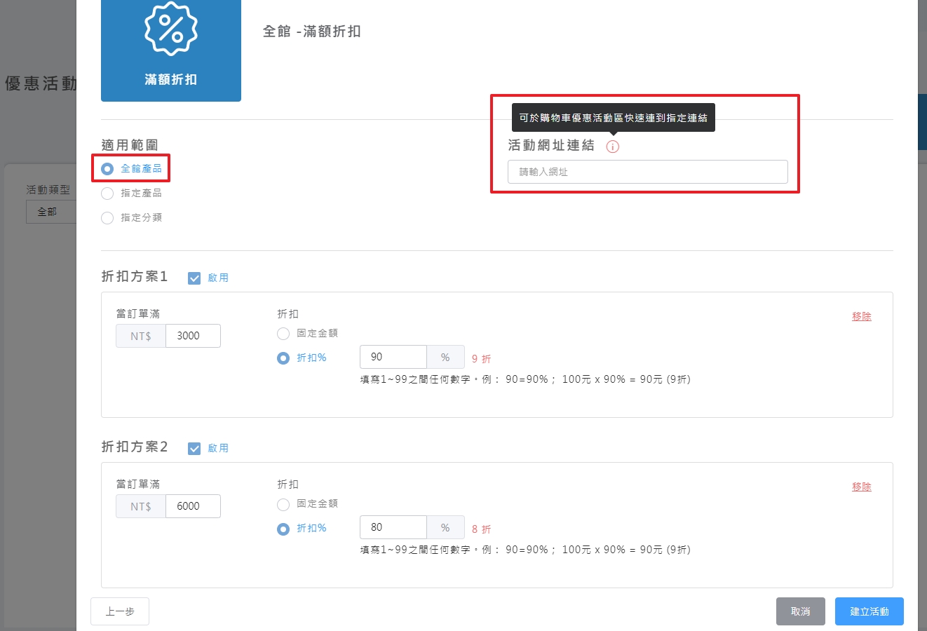選擇「全館產品」後,在下方折扣方式的欄位可設定