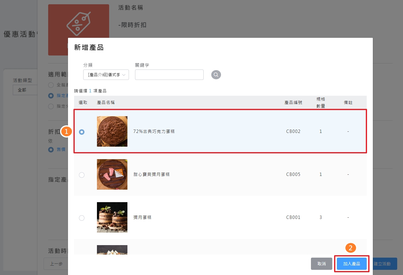 ② 在新增產品視窗中,選擇「指定產品」,並點擊「加入產品」。