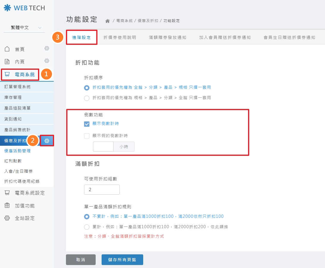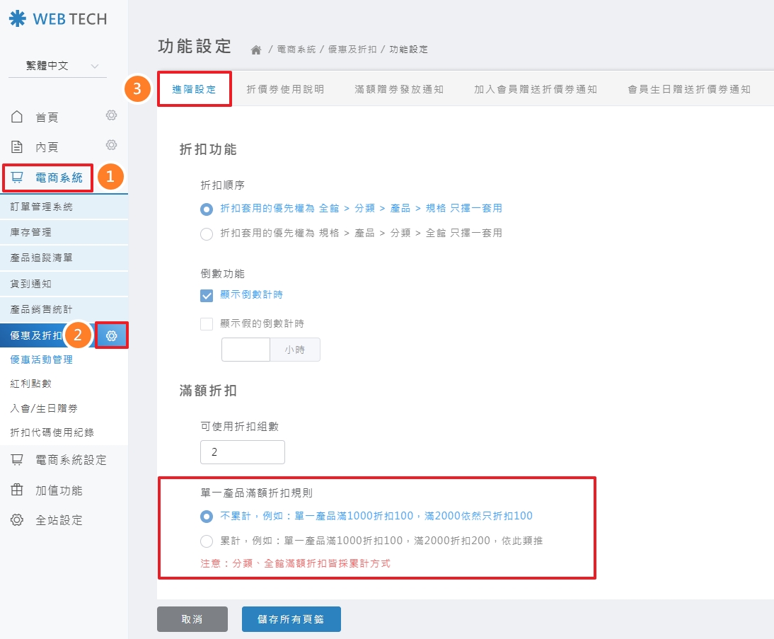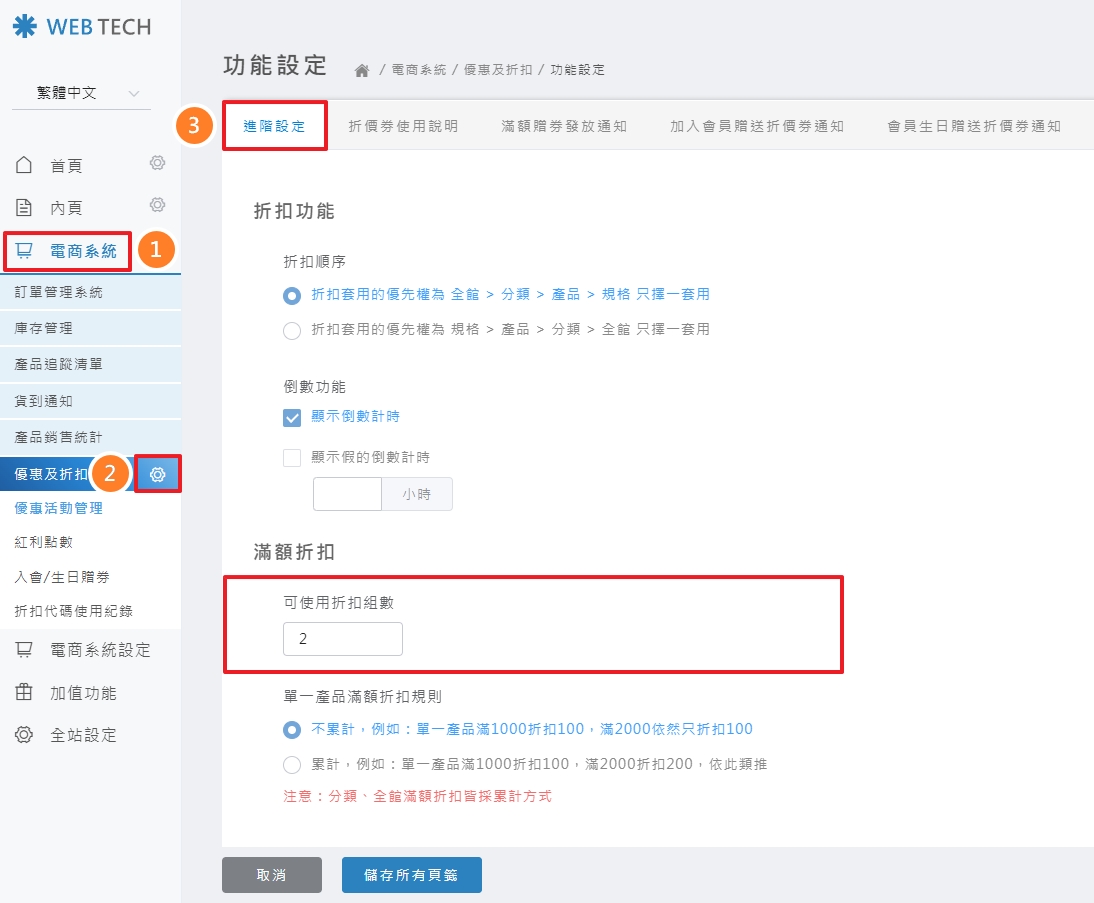點選「電商系統」>「優惠及折扣」旁的設定圖示 > 點選「進階設定」頁籤 >「滿額折扣」> 輸入「可使用的折扣組數」