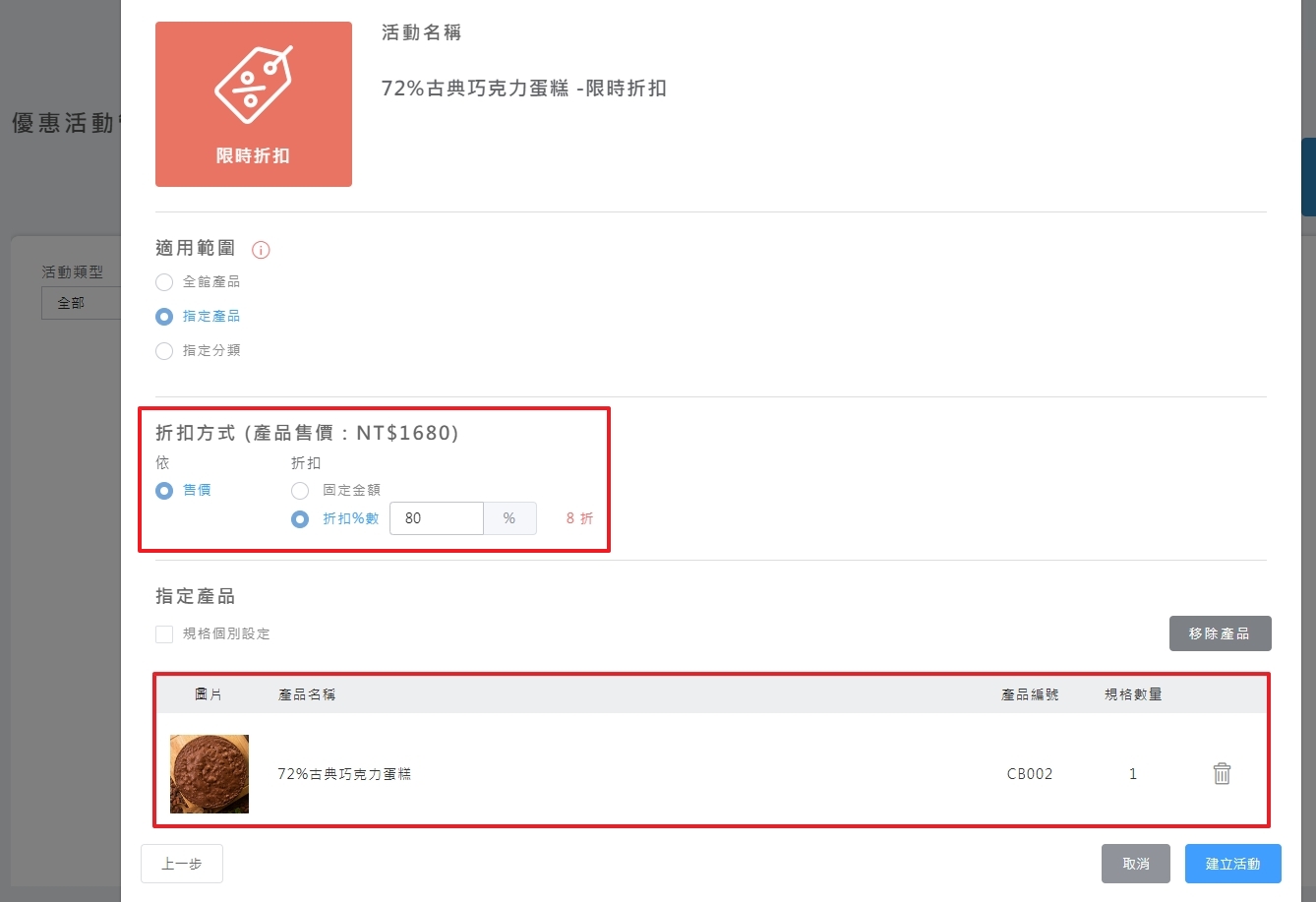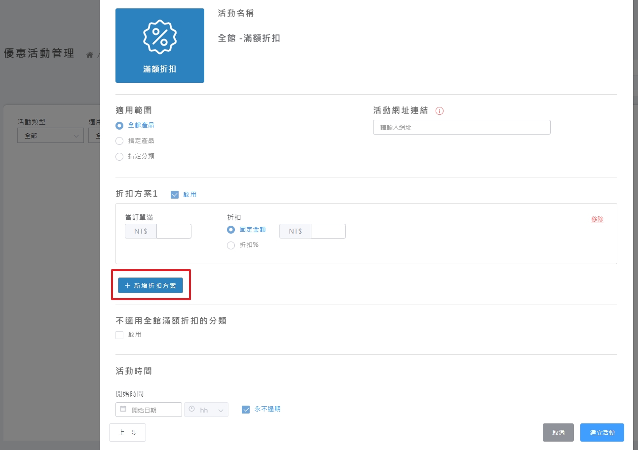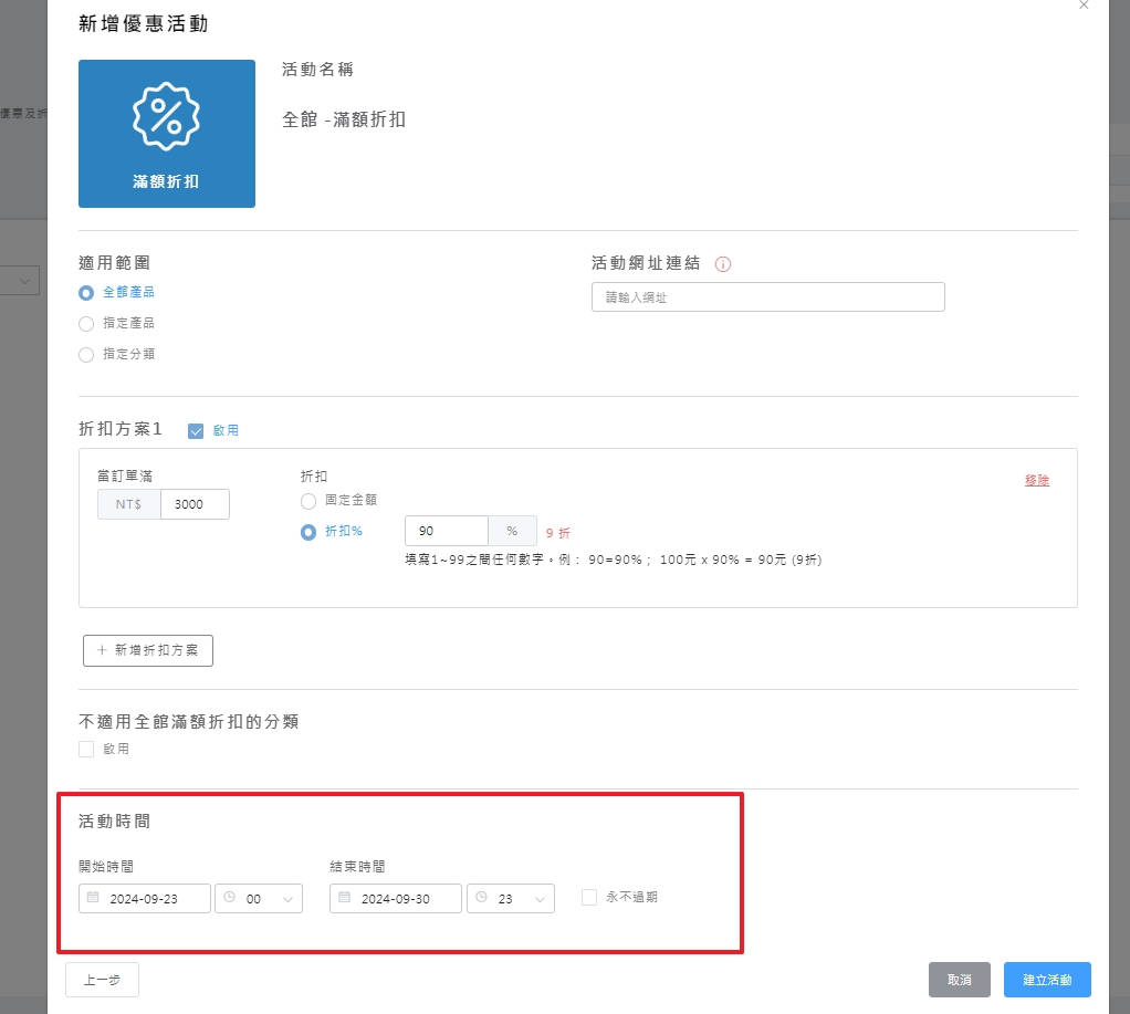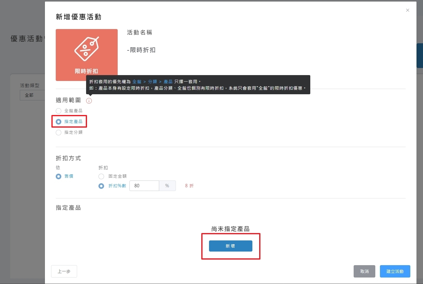 在新增優惠活動視窗中,點選「限時折扣」後點擊「下一步」按鈕