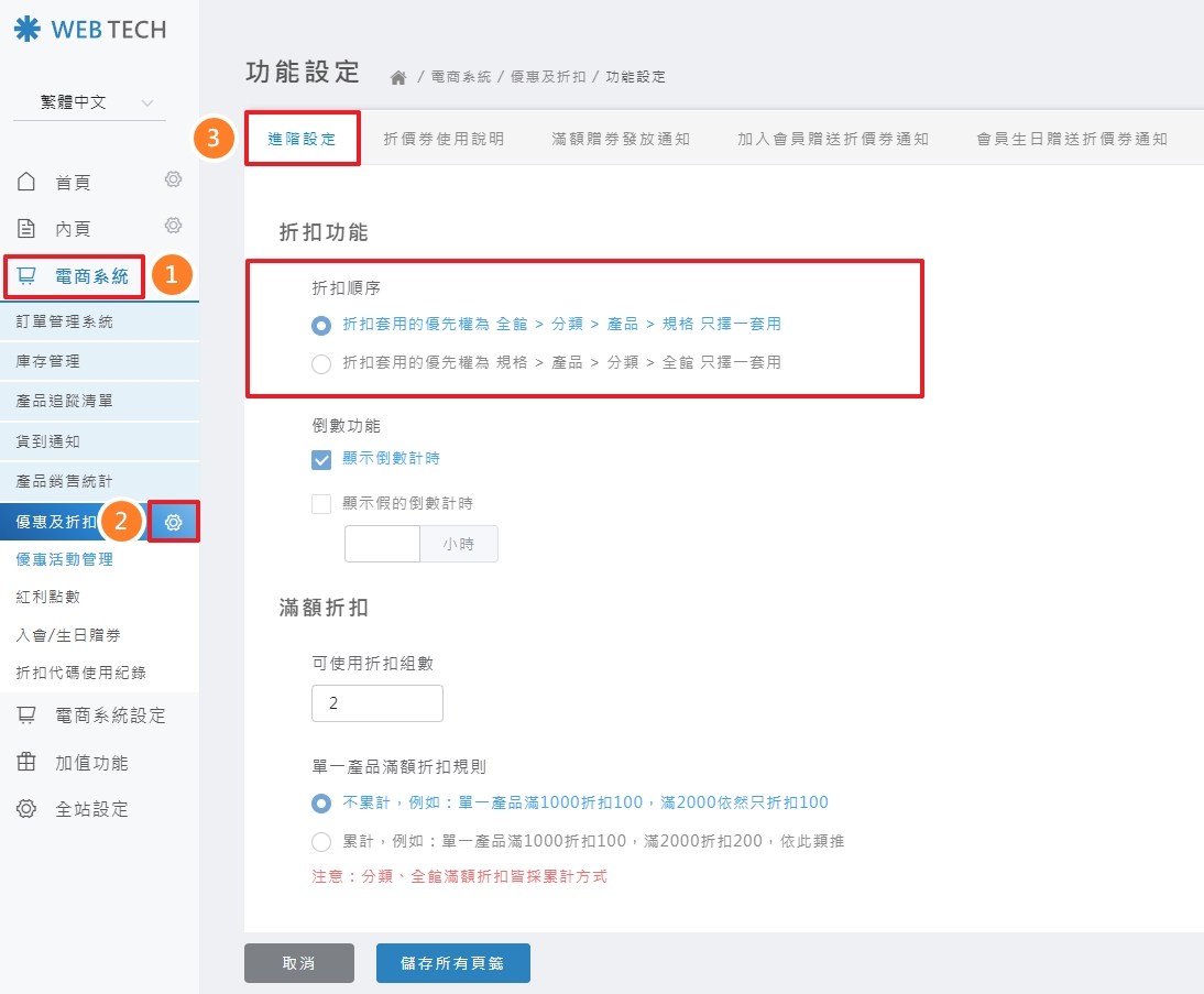 點選「電商系統」>「優惠及折扣」旁的設定圖示 > 點選「進階設定」頁籤 > 「折扣功能」 > 在折扣順序處選擇折扣套用的優先順序