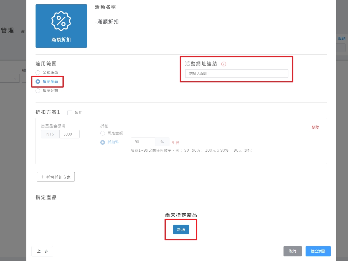 ① 選擇「指定產品」後,在下方指定產品的欄位點擊「新增」。