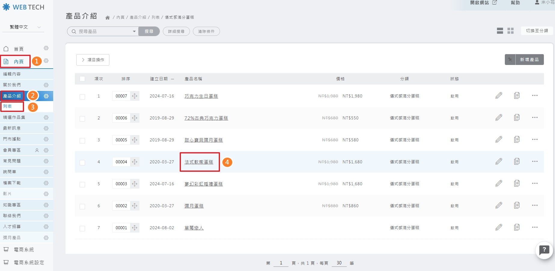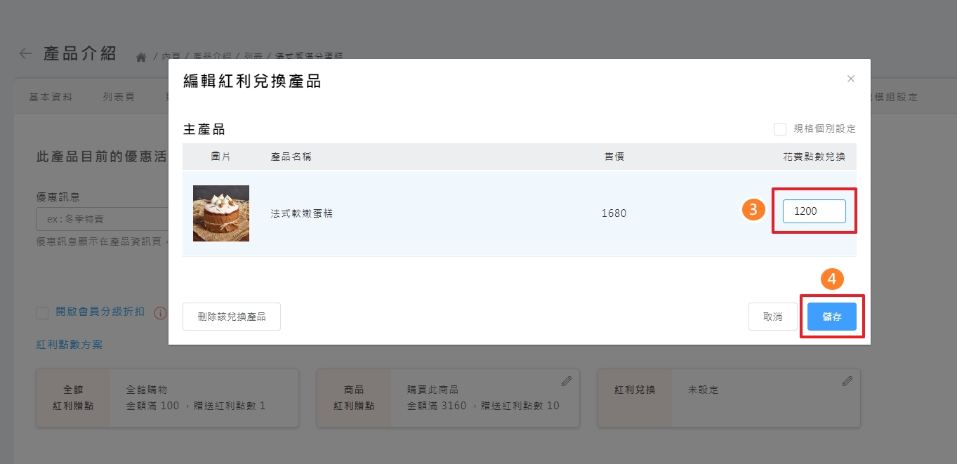 點選「內頁」>「產品介紹」> 「列表」> 點選「要設定紅利點數兑換的產品」