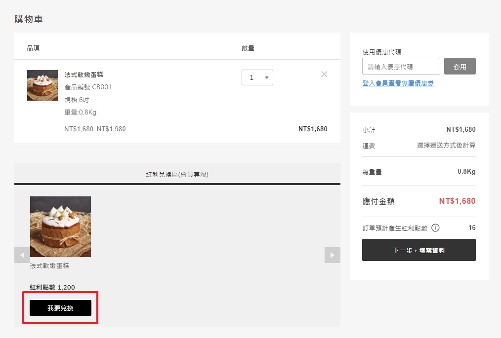 ➤ 即可在購物車的「紅利兌換區(會員專屬)」處點選「我要兌換」即完成。