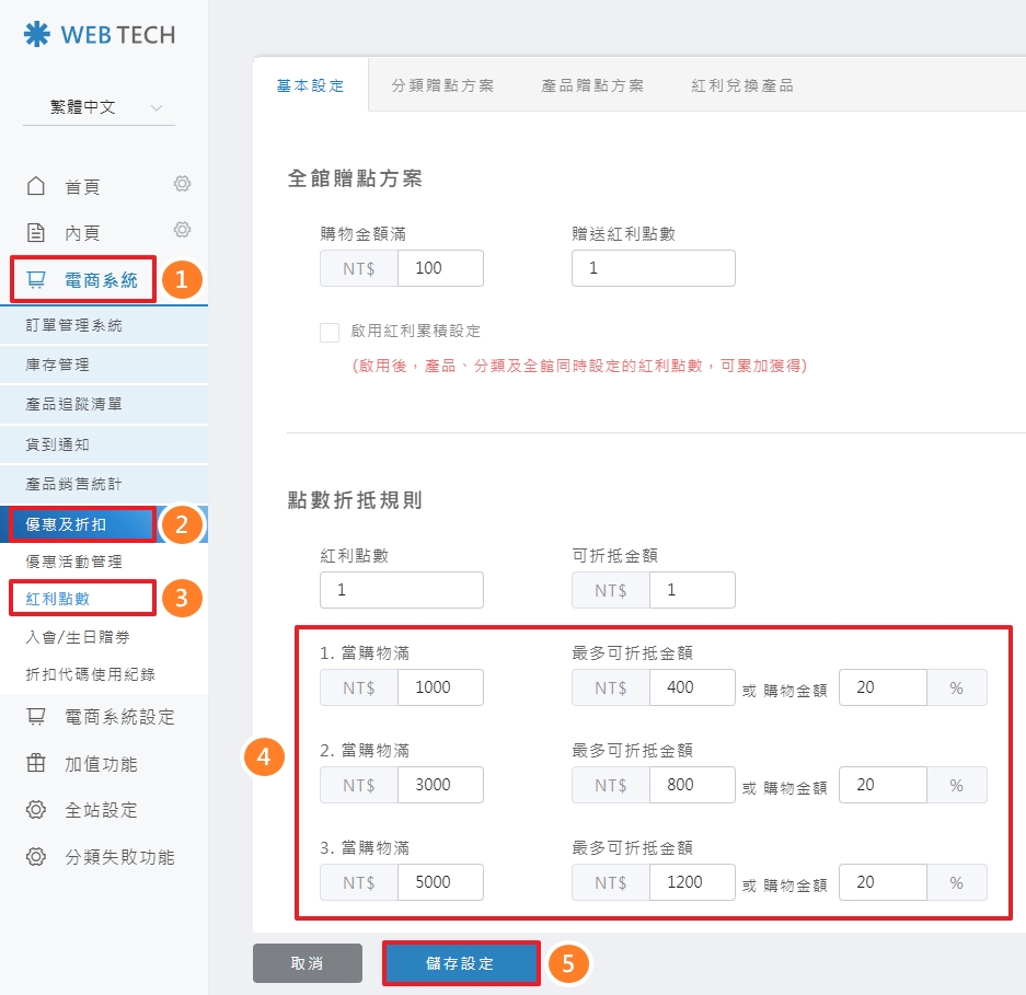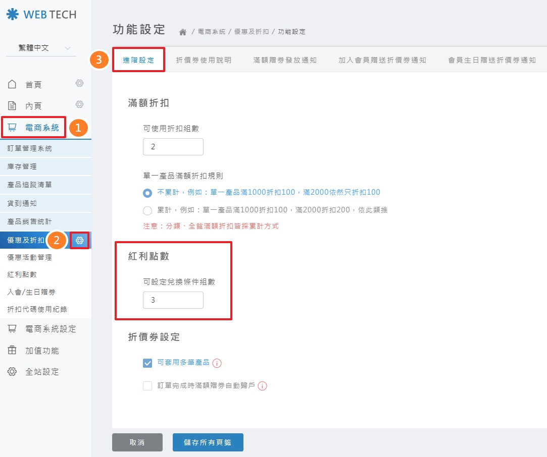 ➷ 設定兌換條件組數(折抵級距) 此處可設定「多組」紅利點數折抵上限,不同消費金額給予不同折抵上限,讓行銷活動設計更靈活。 ※ 當消費金額未達最低門檻,前台就不會顯示紅利折抵區塊。 ⇲ 後台如何設定 STPE 1 ▶ 點選「電商系統」>「優惠及折扣」旁的設定圖示 > 點選「進階設定」頁籤 > 紅利點數 > 設定「紅利折抵級距的組數」(預設為1組) STPE 2 ▶ 點選「電商系統」>「優惠及折扣」>「紅利點數」> 「基本設定」頁籤 > 設定「紅利折抵級距」>「儲存設定」