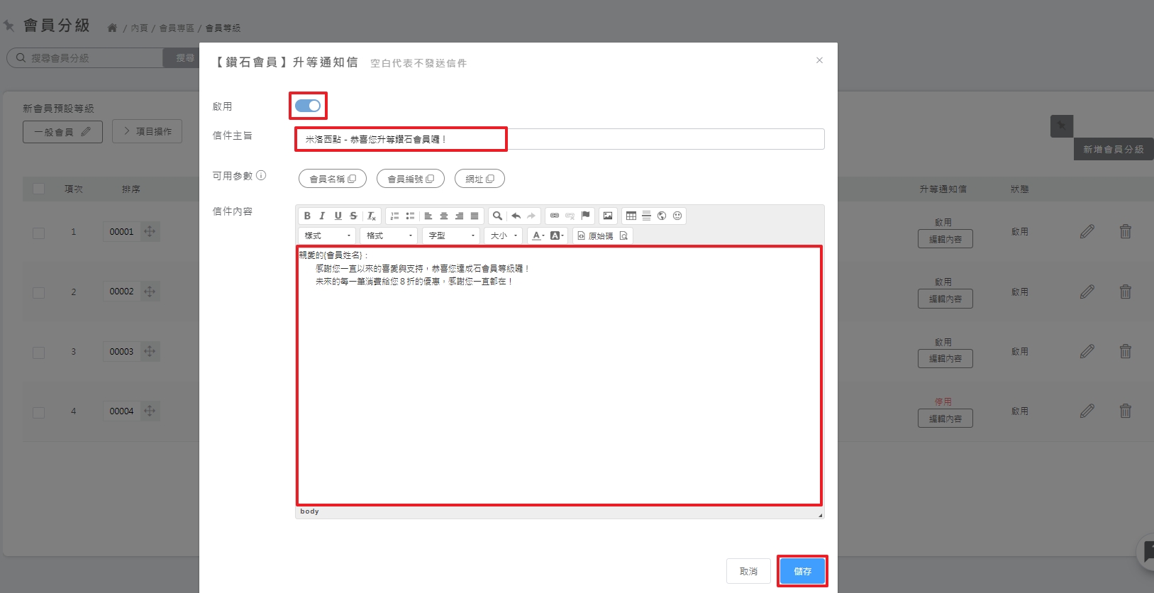編輯「升等通知信」,在會員達成現階段門檻時,系統自動發信通知。